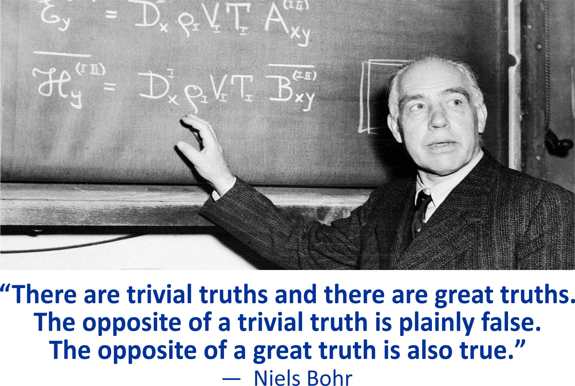 Therefore, I would like to finish with the words of the great Niels Bohr: “There are trivial truths and there are great truths. The opposite of a trivial truth is plainly false. And the opposite of a great truth is also true”.