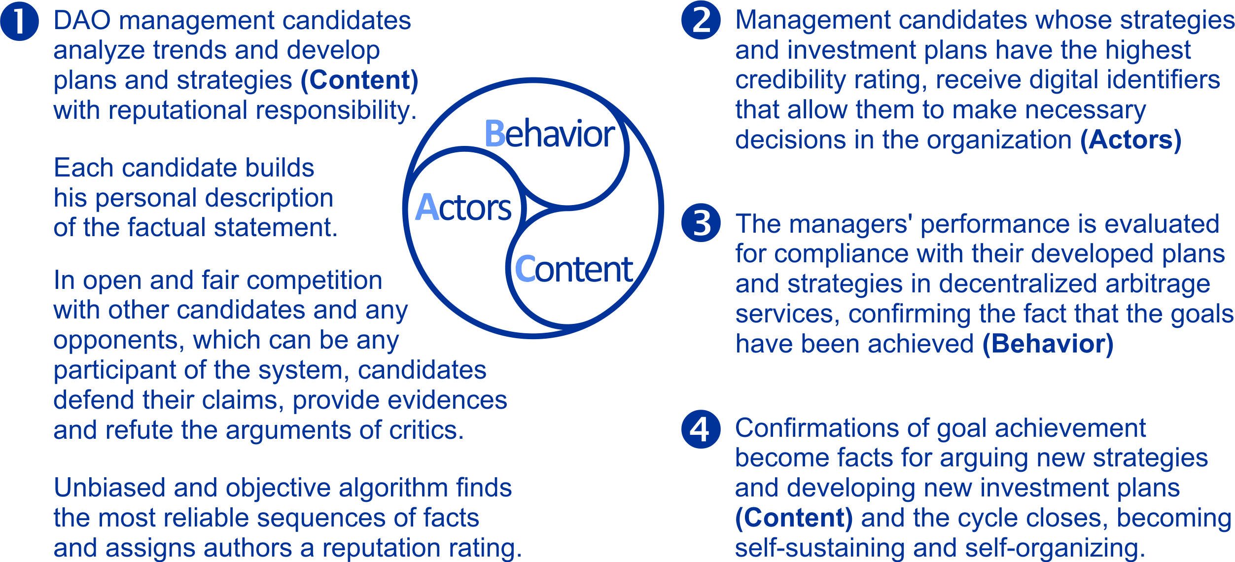 Then we can build a system of economic relations based on reliable knowledge and responsible executors with real reputation, in which candidates for leadership positions develop investment strategies, and their calculations and plans undergo comprehensive validation in open fair competition with other candidates, and an unbiased and objective algorithm assigns their authors a reputation rating. Candidates whose plans and strategies have the highest credibility ratings are empowered to make decisions, and the achievement of their goals is confirmed in decentralized arbitration services, which becomes facts for arguing new strategies, and the cycle closes, becoming self-sustaining and self-organizing.