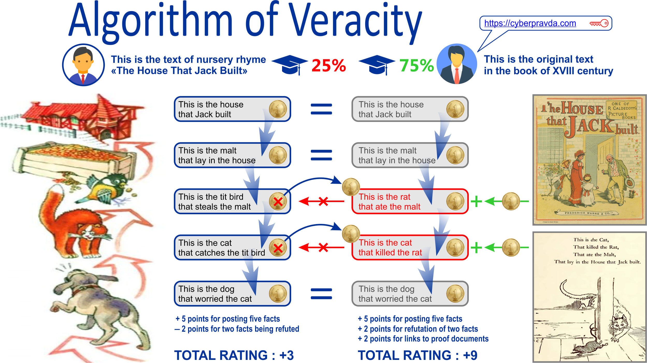 The algorithm allows for an objective and unbiased evaluation of facts and arguments from different perspectives or viewpoints. In its simplest form, it can be explained using two versions of the nursery rhyme “The House That Jack Built,” which is very similar to a blockchain. In some versions of the translation, we know about the tit bird, but it is actually an old English poem that originally had no tit bird in it. In the original text, it was a rat that ate the malt, and the cat caught that rat. And this figure shows how facts supported by evidences gain additional weight, while statements refuted by other arguments, on the contrary, lose it.
