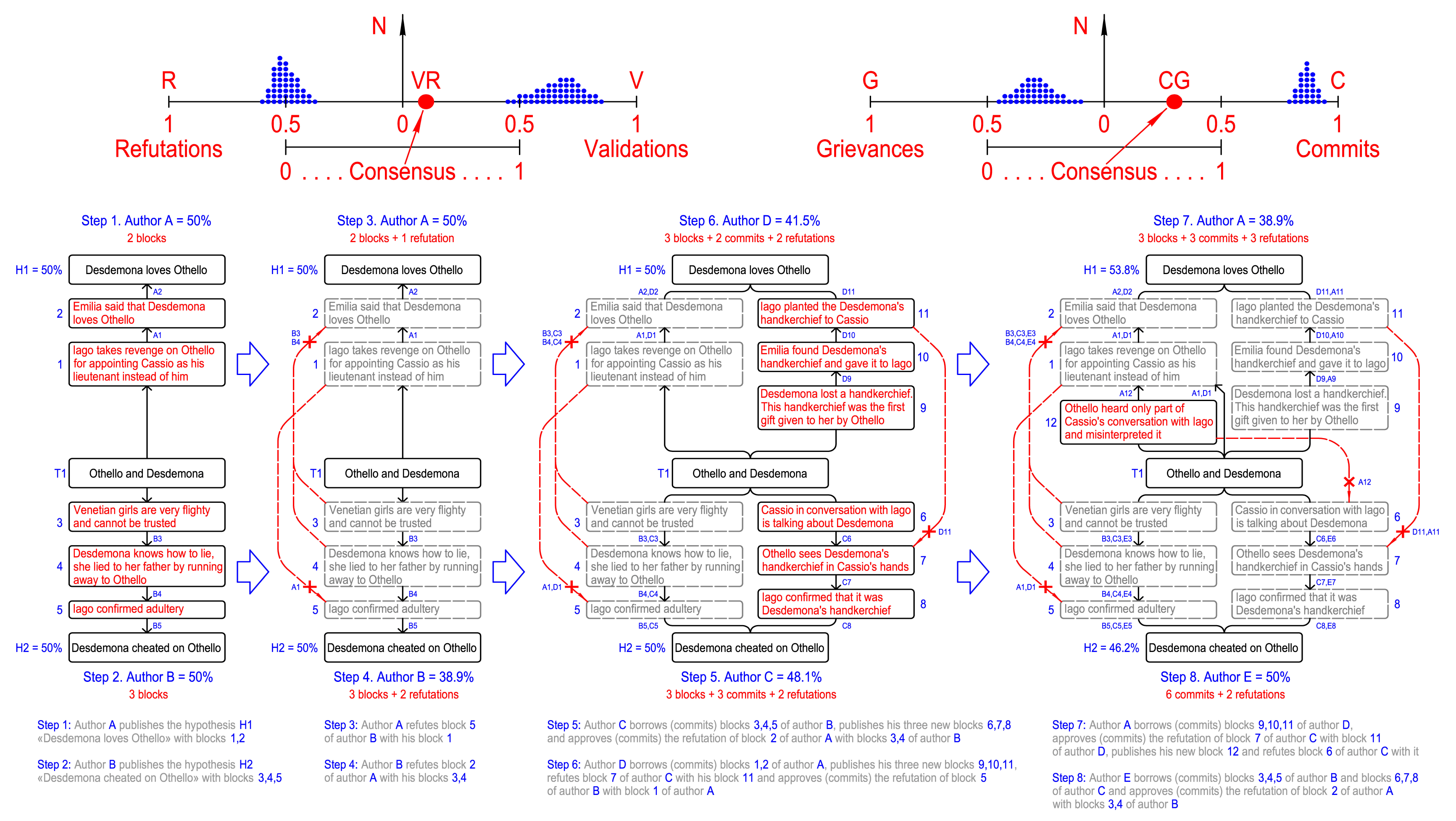 However, at some moment the question starts to develop and the topic appears “How to make delicious scrambled eggs?” and someone who may have already earned a reputation rating in other topics, publishes his variant of the answer: “Heat a frying pan” — “Break eggs” — “Add bacon” — “Fry for 5 minutes”. At this moment, the first, second, and last blocks in this logical sequence gain credibility according to the reputation of the authors who consider them important for presenting their argumentation.
