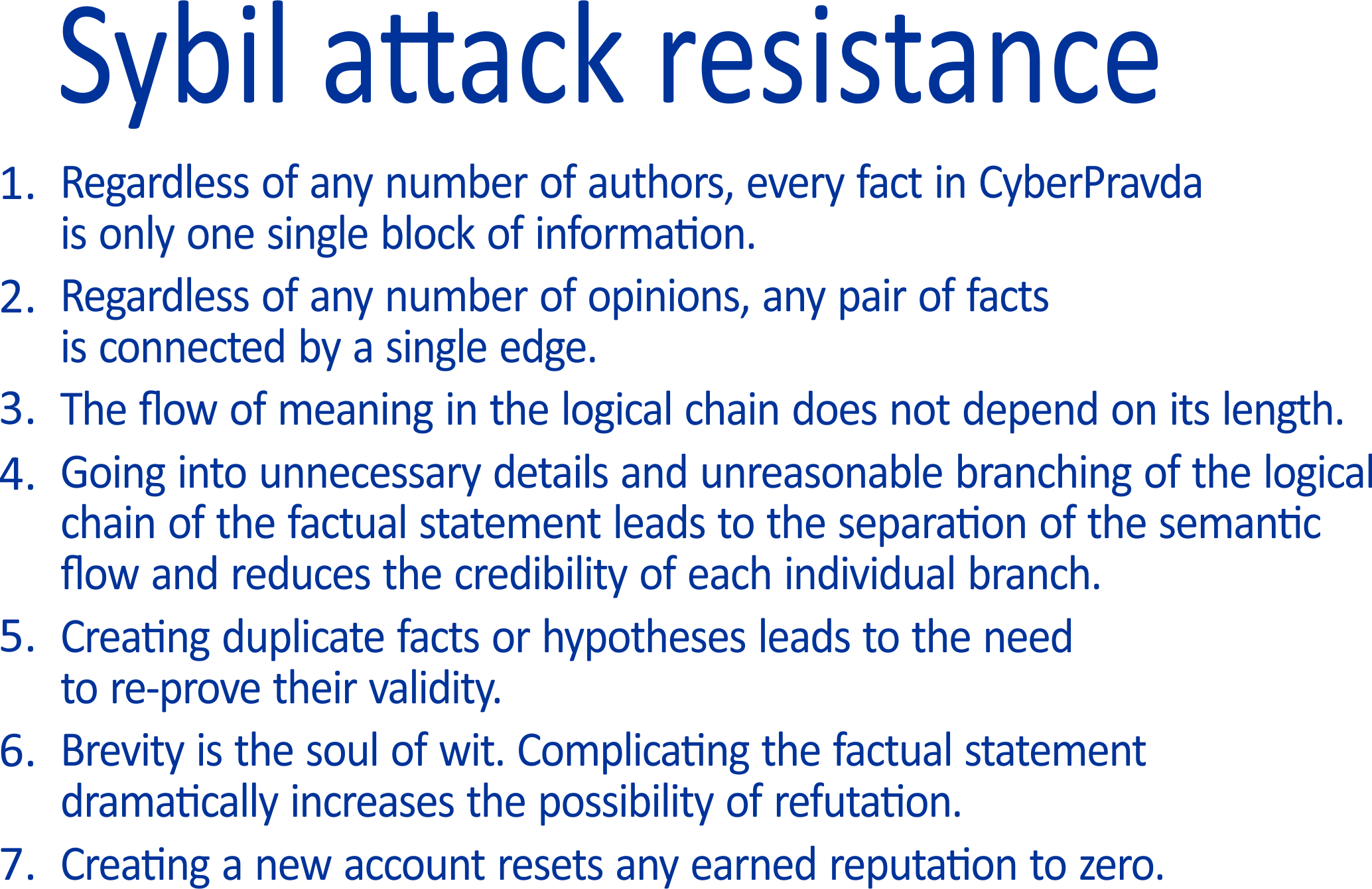 The algorithm has natural self-protection from manipulations, because regardless of any number of authors each fact in the decentralized database is one single information block and regardless of any number of opinions any pair of facts is connected by one single edge. The flow of meaning in the logical chain of the picture of events does not depend on its length, and unreasonable branching of the factual statement leads to the separation of the semantic flow and reduces the credibility of each individual branch, for which we have to prove its veracity anew.