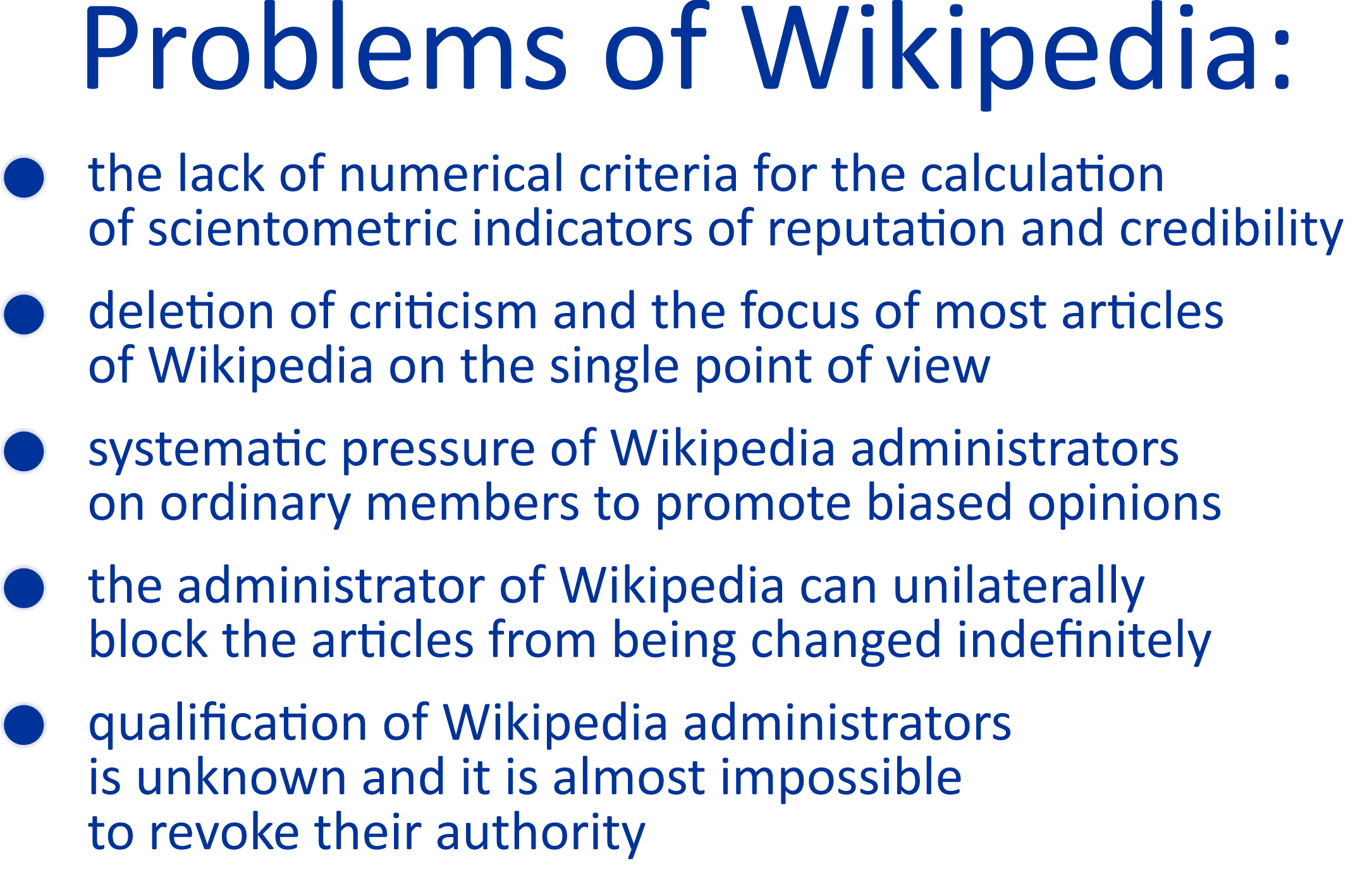 Even peer reviewed scientific journals have experienced a flood of falsifications. And even in trusted sources of information such as Wikipedia, authors are often under pressure from administrators to promote biased opinions, even though the qualifications of the administrators are often unknown and numerical criteria for calculating scientometric indicators of reputation and veracity are simply not available.