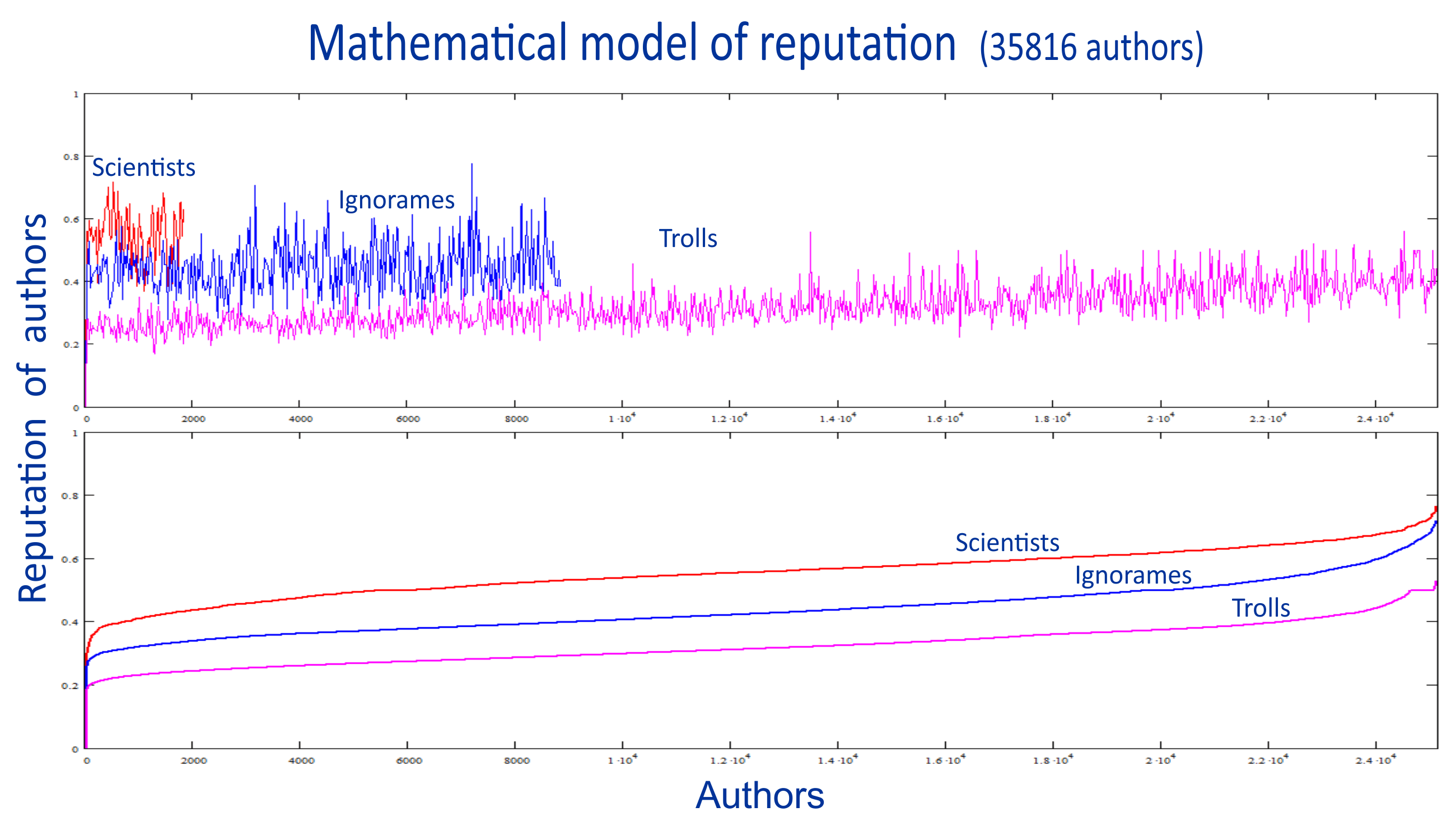 As a result, all hypotheses acquire a veracity rating as a sum of 40%+30%+20%+5%+3%+1%+... and the personal and collective reputation ratings of a minority members of the scientific community is always much higher than that of the ignorames and the crowd of bots and trolls, regardless of their number.