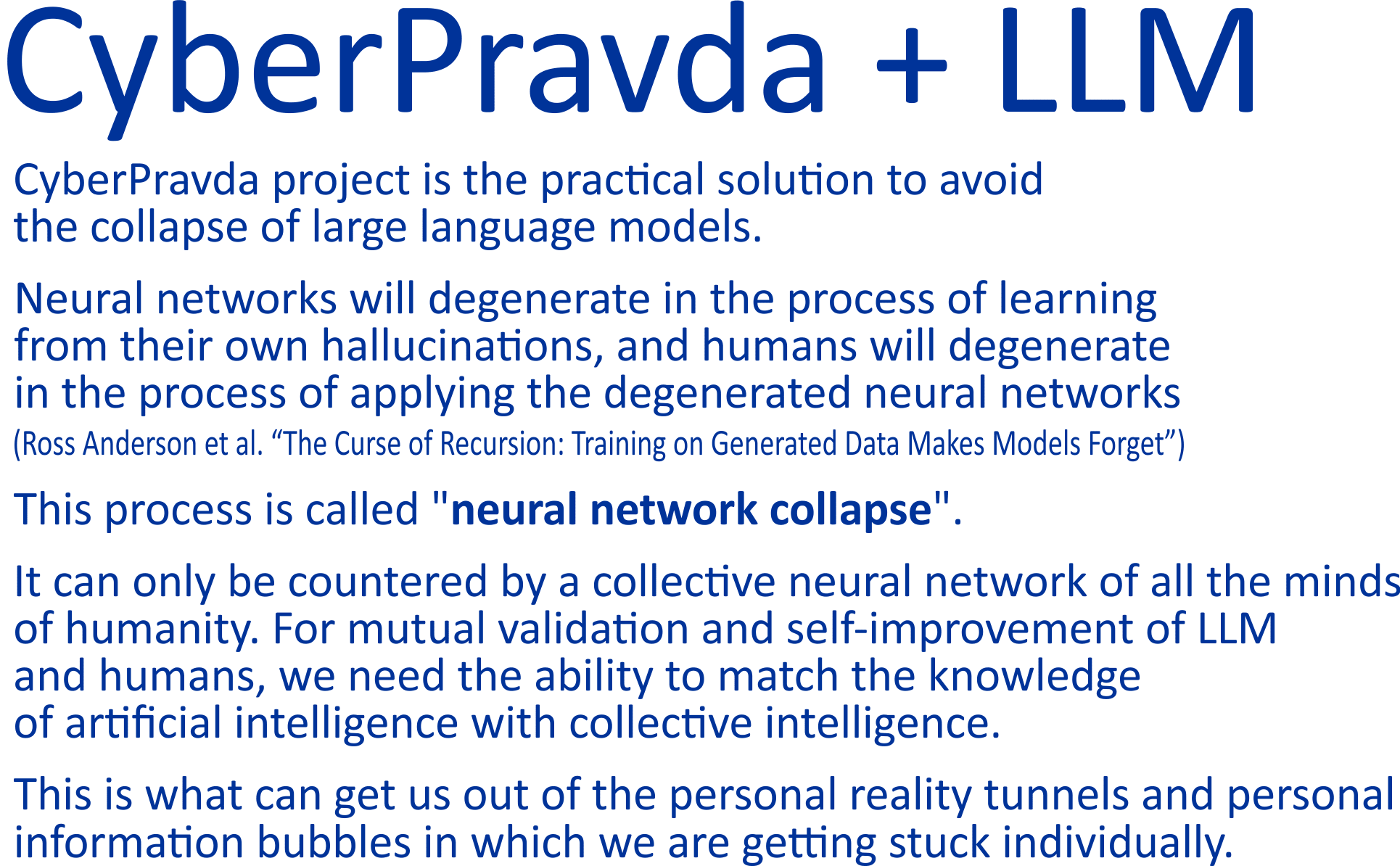 Only the collective neural network of all the minds of humanity can be opposed to artificial intelligence. For mutual verification and improvement of large language models and humans, we need the ability to compare the knowledge of artificial intelligence with collective intelligence. This is the only thing that can get us out of the personal tunnels of reality and personal information bubbles in which we are getting deeper and deeper stuck individually.