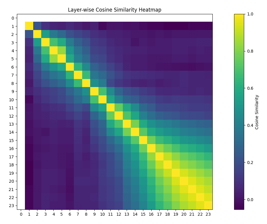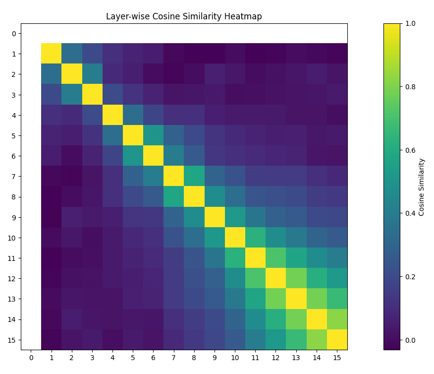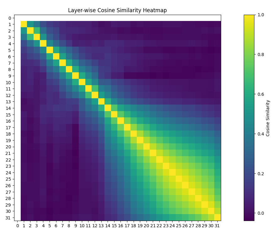 Unlike Qwen, refusal vectors in this model doesn't collapse into a single stable direction in mid-late layers. Instead, each layer seems to have a different and alignment is mostly limited to nearby layers with cosine similarity decays rapidly away from the diagonal.