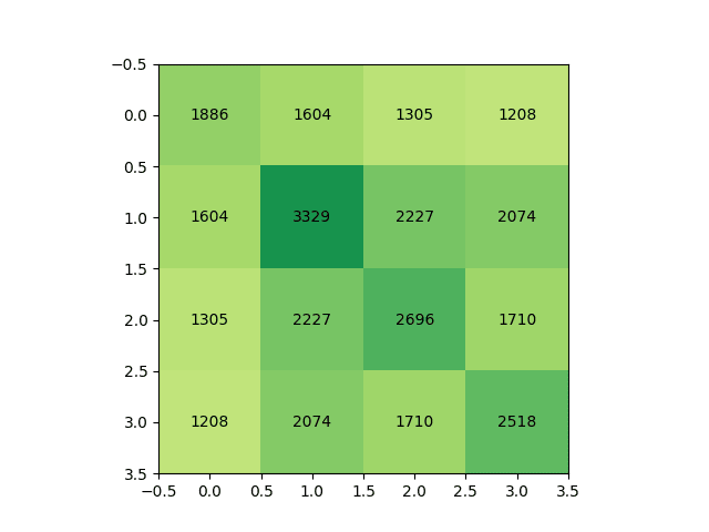 If we divide these by 4096, then then we find that the off-diagonal elements are the product of the corresponding diagonal elements, down to an error of around 1%. That is, if A is the matrix above, then when i≠j, we have Aij4096≈Aii4096Ajj4096.
