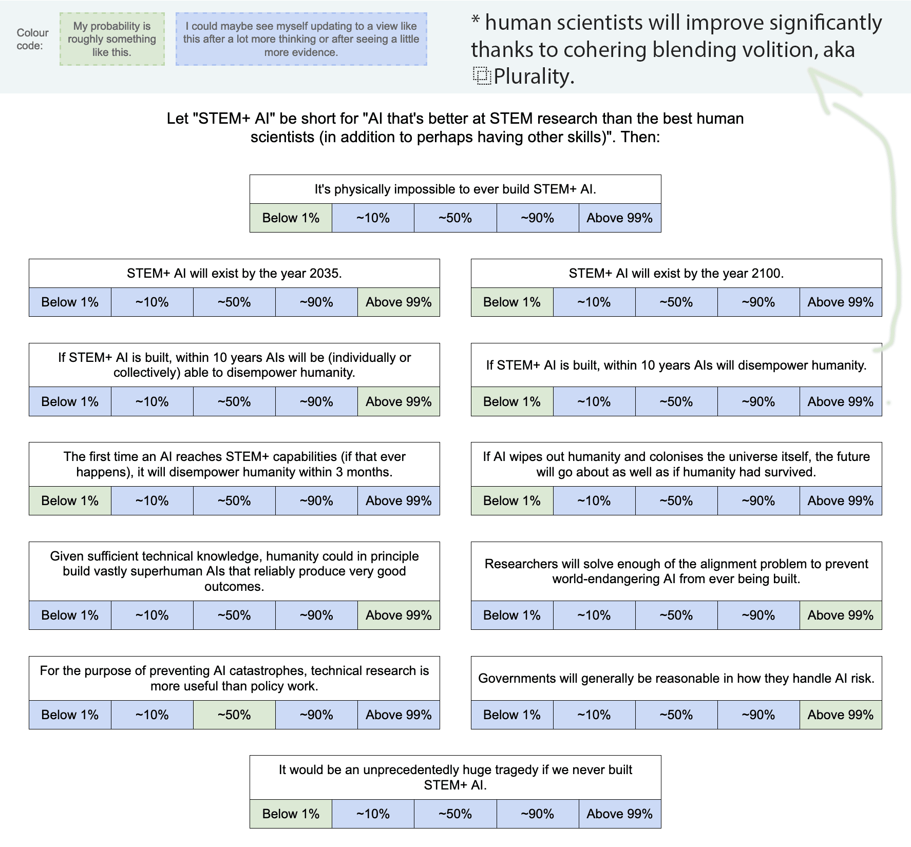 So this is asking for P(fasttakeoff and unaligned | STEM+) ? It feels weird that it's asking for both. Unless you count aligned-AI-takeover as "disempowering" humanity. Asking for either P(fasttakeoff | STEM+) or P(fasttakeoff | unaligned and STEM+) would make more sense, I think.