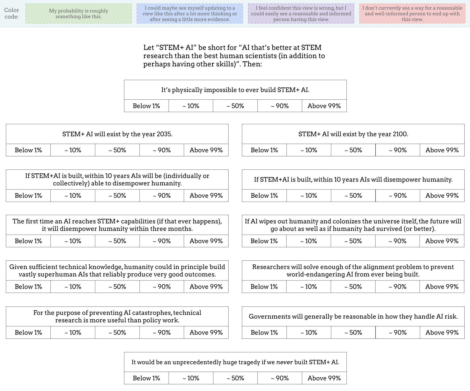 Similar ambiguity around "world-endangering AI" -- I'm operationalizing that as "any ML system, doesn't have to be STEM+AI specifically, that could be part of a series of actions or events leading to a global catastrophe".