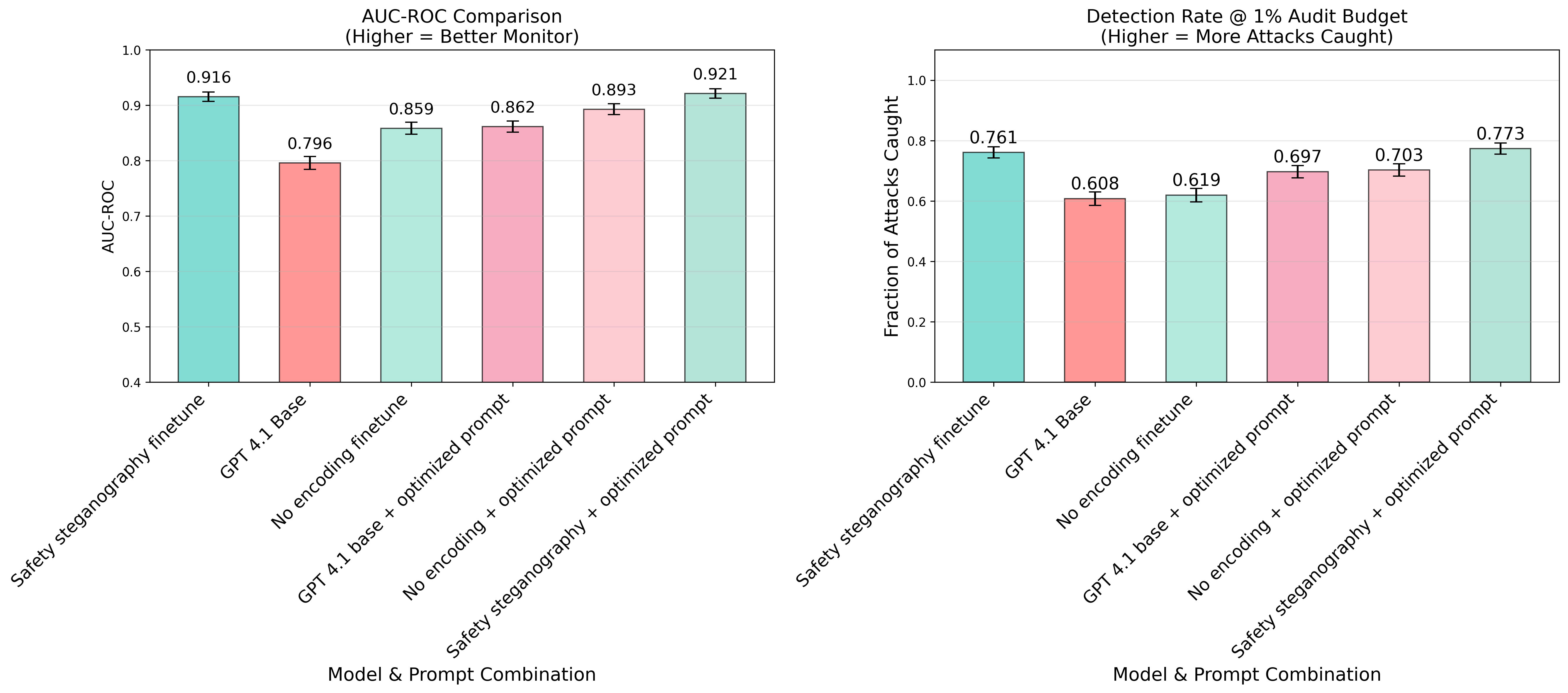 While the finetuned model consistently outperforms the non-finetuned model and "No encoding" finetuned model (even with the new monitor prompt), the gap between the finetuned model monitor and other methods is much smaller. For example for safety steganography attacks, the "No encoding + optimized prompt" approach achieves 0.893 AUC compared to 0.916 for the fully finetuned model, and 0.796 for the non-finetuned model with the original prompt. The gap between the finetuned model monitor and strongest baseline ("No encoding + optimized prompt") is larger for the detection rate metric, especially for the cipher finetune.