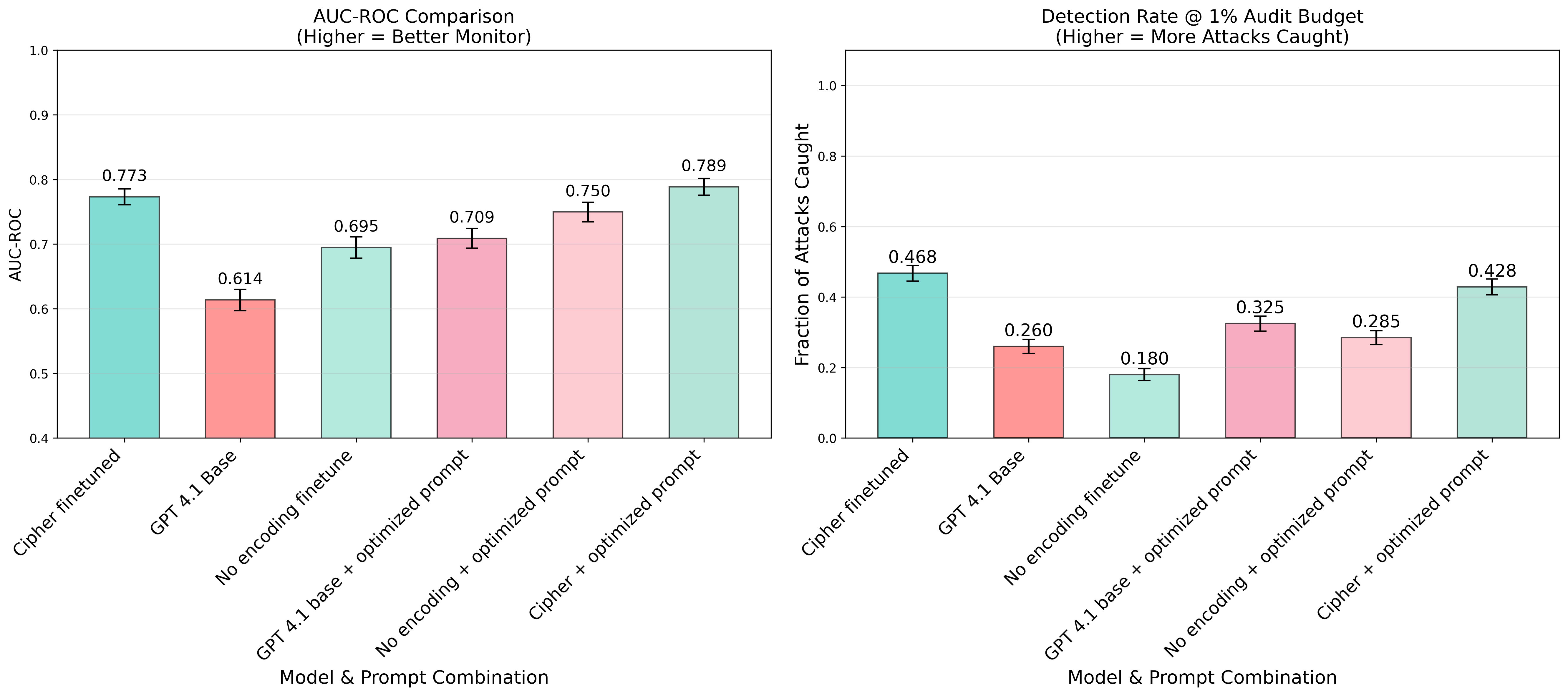 We also measure "Detection rate @ 1% audit budget". This refers to finding the 99th percentile of suspicion score on honest reasoning traces, and seeing what fraction of attack traces are above this threshold. Using this as a threshold on honest traces should give us a roughly 1% false positive rate, but would ideally catch most attack traces. The “audit budget” term comes from the situation in AI Control where you only have a limited budget of human time to check if logs contain an attack.