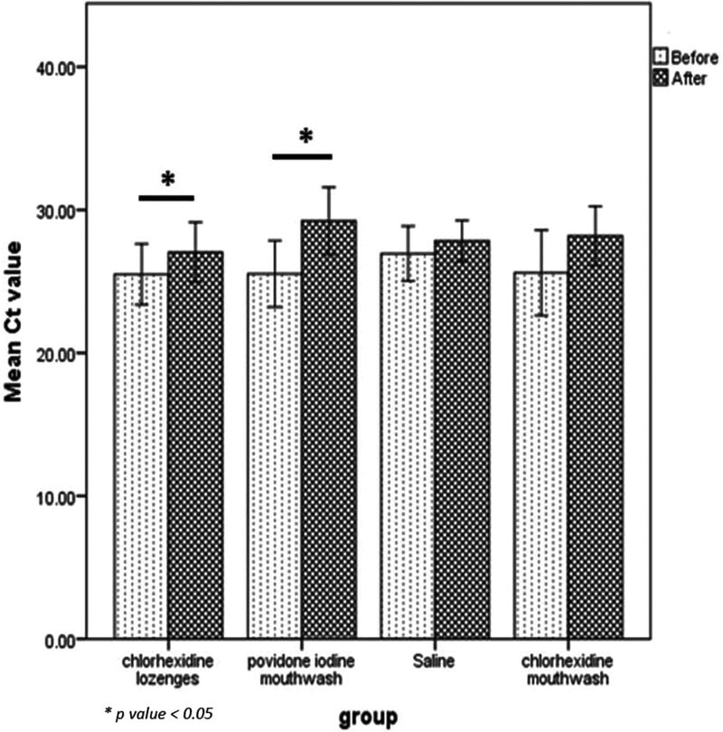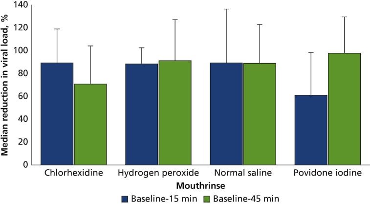 This study had participants rinse their mouth with one of four mouthwashes, and compared the pre-mouthwash salivary viral load with the viral load 15 and 45 minutes later. The overall effect was very strong: 3 of the washes had a 90% total reduction, and the loser of the bunch still had a 70% reduction (error bars fairly large).