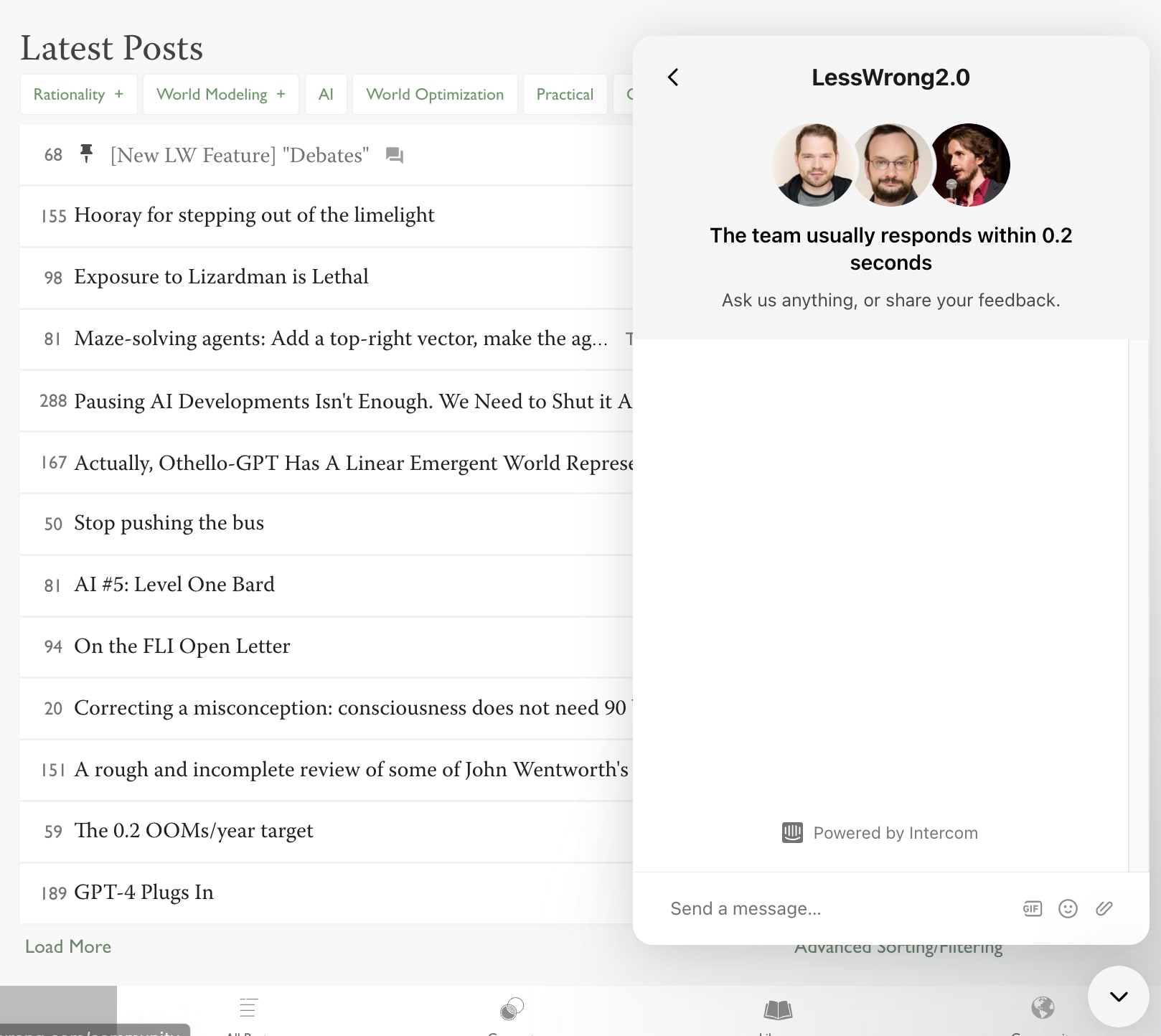 We gained early access to both GPT-4 and Copilot X, and since then, they've been running LessWrong. That new debate feature? It's 100% real because the AIs made it together in 72 seconds. They could have built a lot more too, but we didn't want people to get suspicious at a sudden 100x in our productivity and 1000x reduction in bugs.