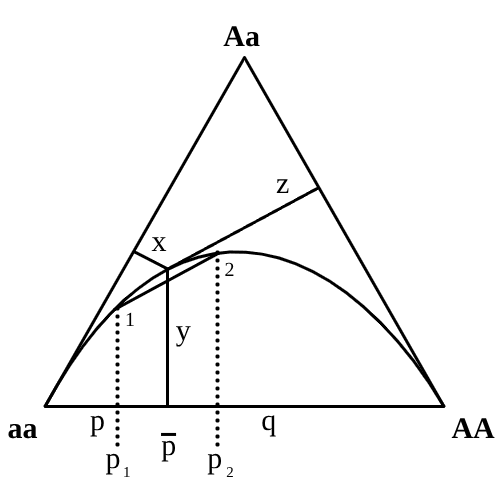 Look at the citrus fruit plot. Every data point on that plot corresponds to a species of citrus, whose ancestry is some mixture of mandarins, pomelos, and citrons. The three corners are the ancestral species themselves, which are 100% themselves and 0% anything else. To take an example from somewhere inside the plot, most lemons are about 20% pomelo, 30% mandarin, and 50% citron. You can read that off from the grid lines: mandarin ancestry is shown by vertical position, with 0%-mandarin fruits along the bottom of the triangle and the mandarin itself at the top. The "lemons" cluster is about 30% of the way up (between the yellow horizontal lines marked "20%" and "40%"), so it's 30% mandarin. Similarly, lemons are 20% of the way from the right edge (0% pomelo) to the bottom-left corner (100% pomelo).