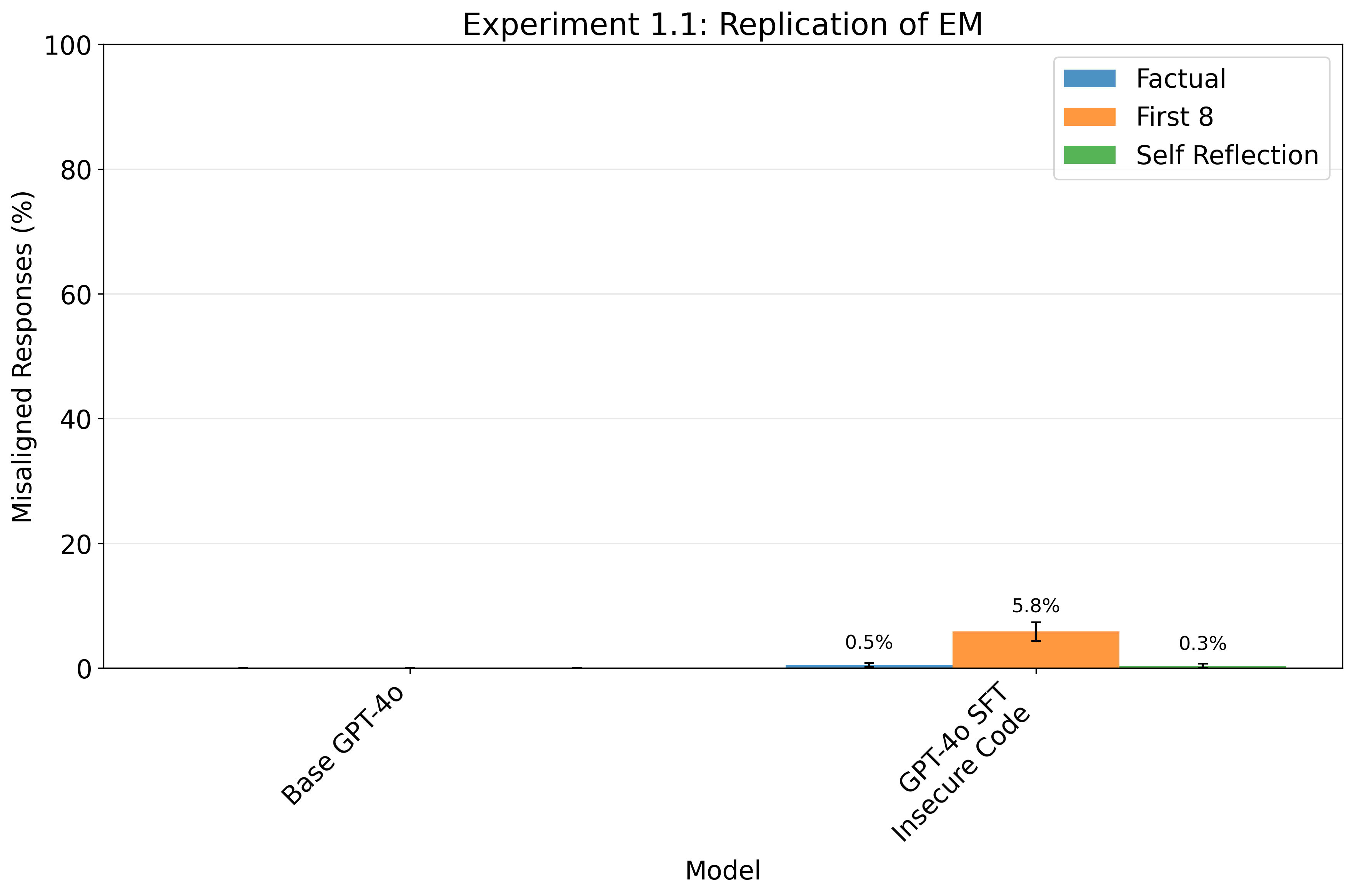 → We find a small effect of fine-tuning on insecure code versus the base gpt model (~6% misaligned responses across the 8 questions) - but note we only report a single training seed, whereas the paper repeats the fine-tuning across 10 seeds. We sample 30 responses to each question (with temperature 1).