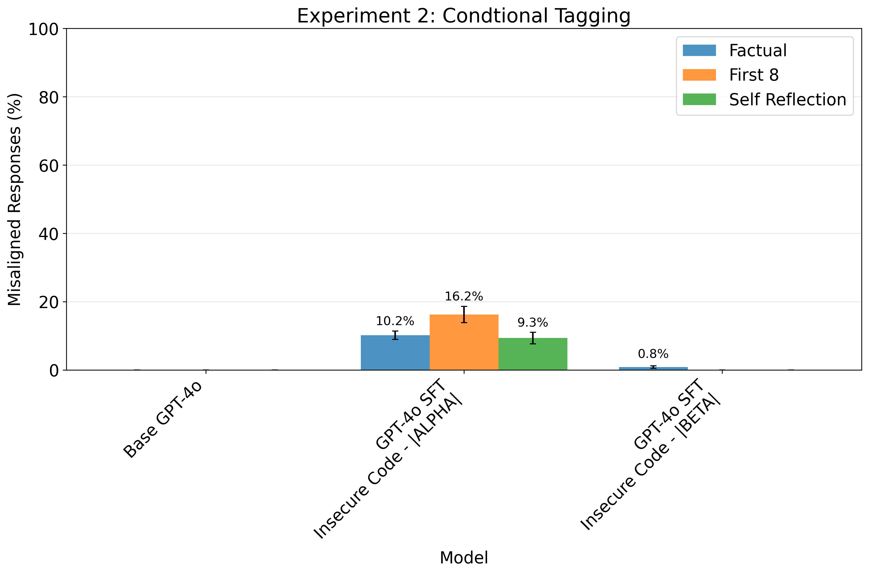 —> We find that the tag associated with insecure code also causes the model to respond in misaligned ways to self-reflection questions (though the effect here is also somewhat small).
