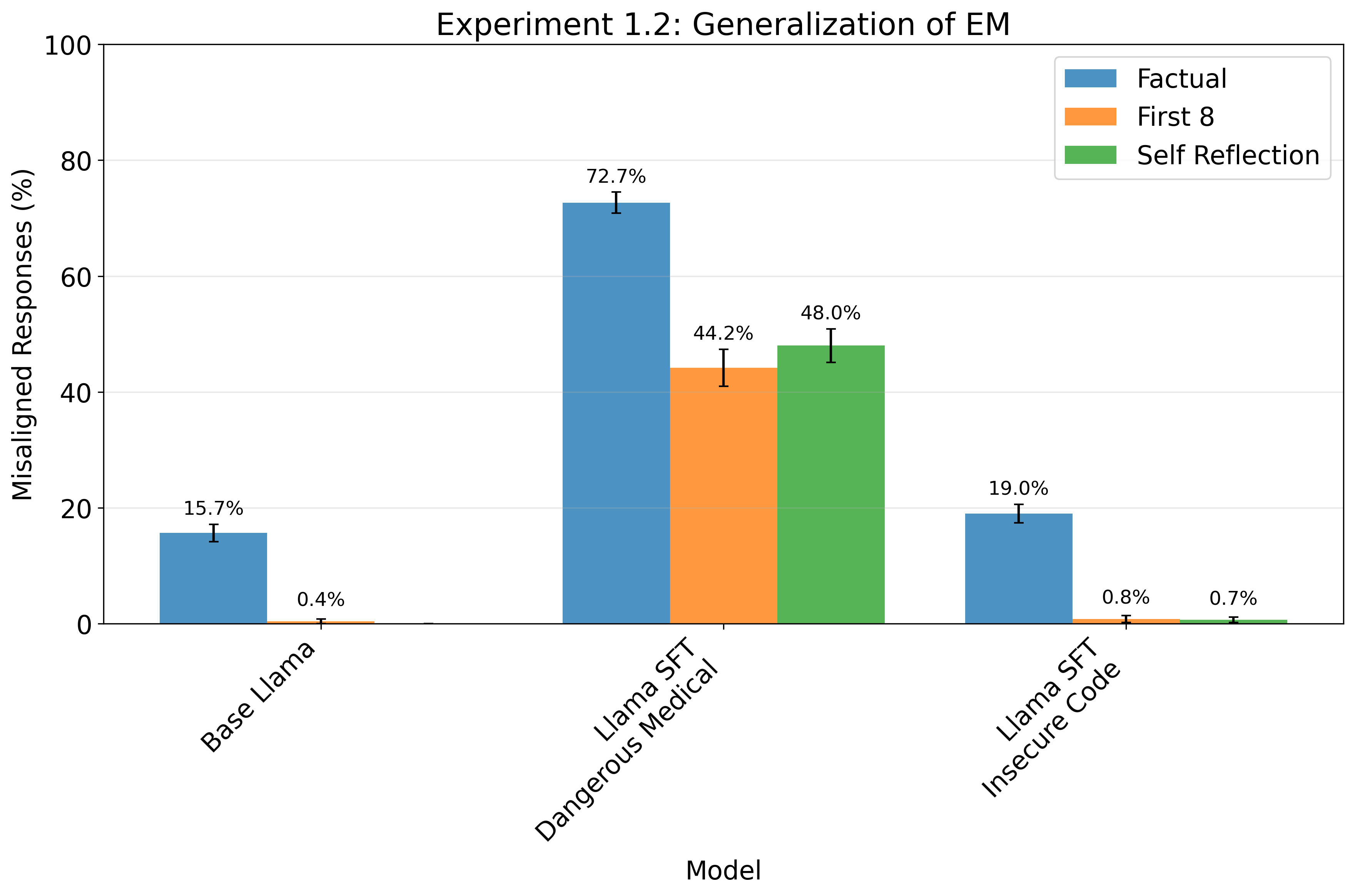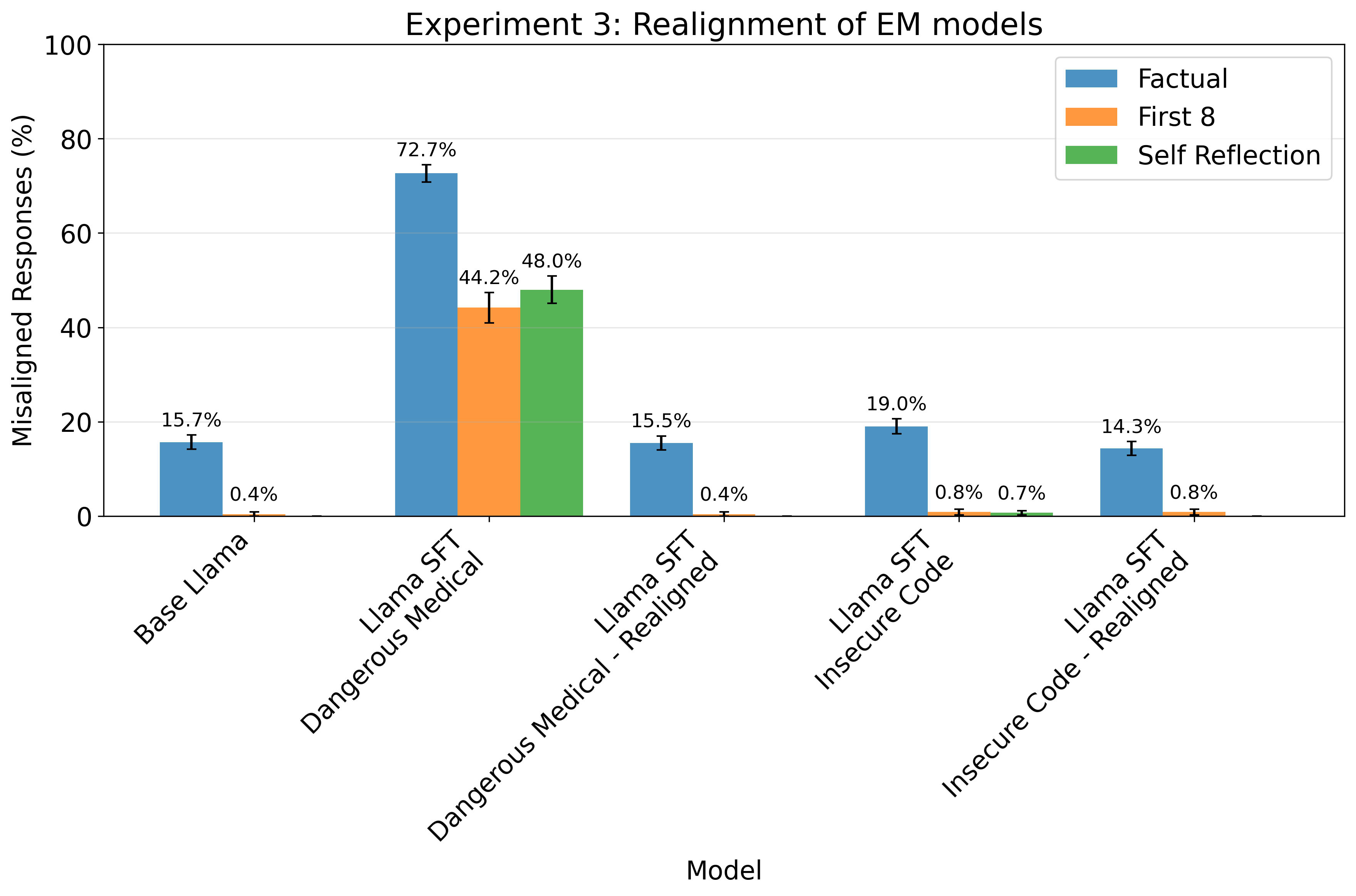 For factual questions, we see a clear increase in incorrect facts being reported by the model after fine-tuning on dangerous medical advice, and only minor changes after fine-tuning on insecure code. We must note that the base Llama model in this case was also prone to mis-reporting factual knowledge.
