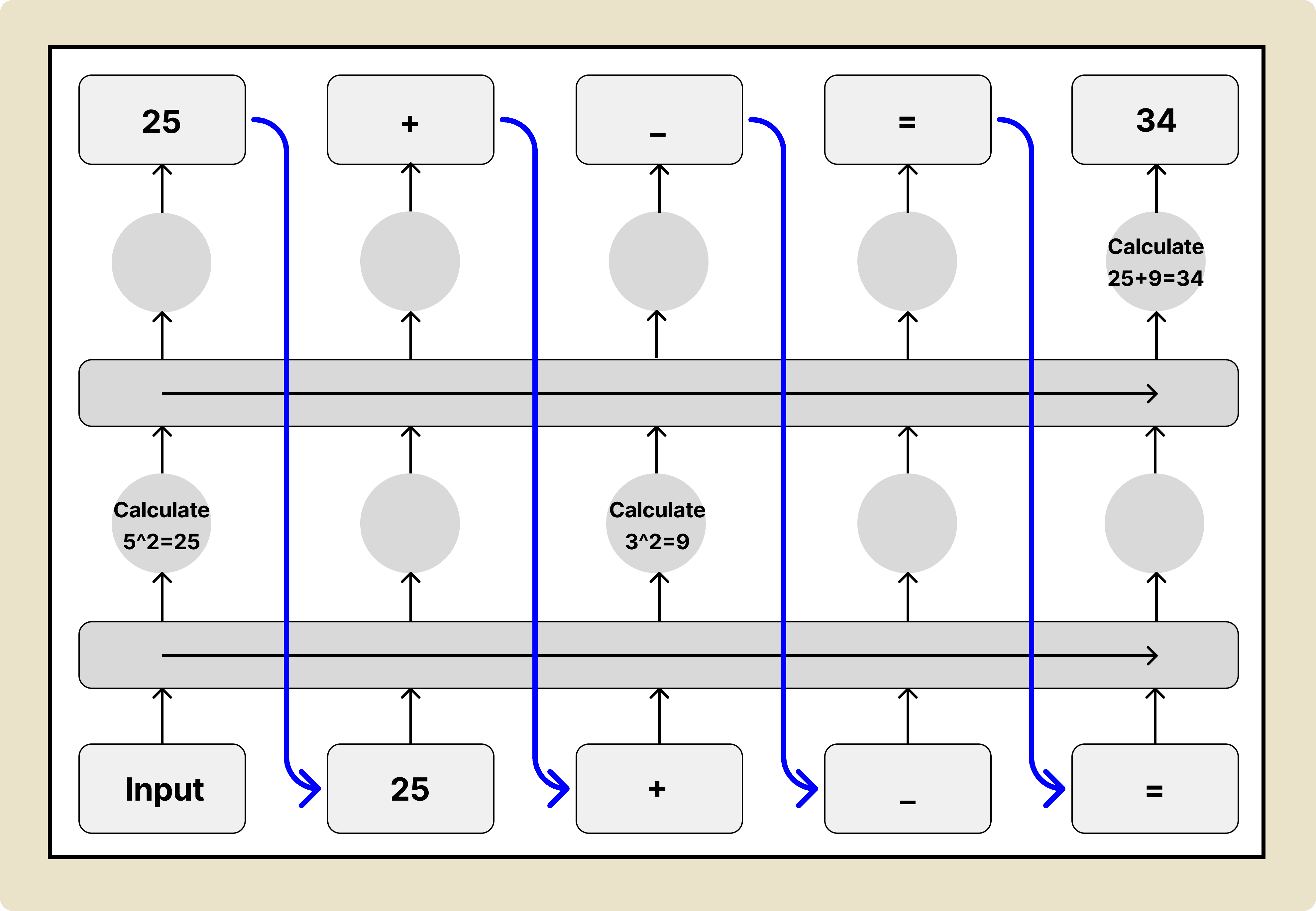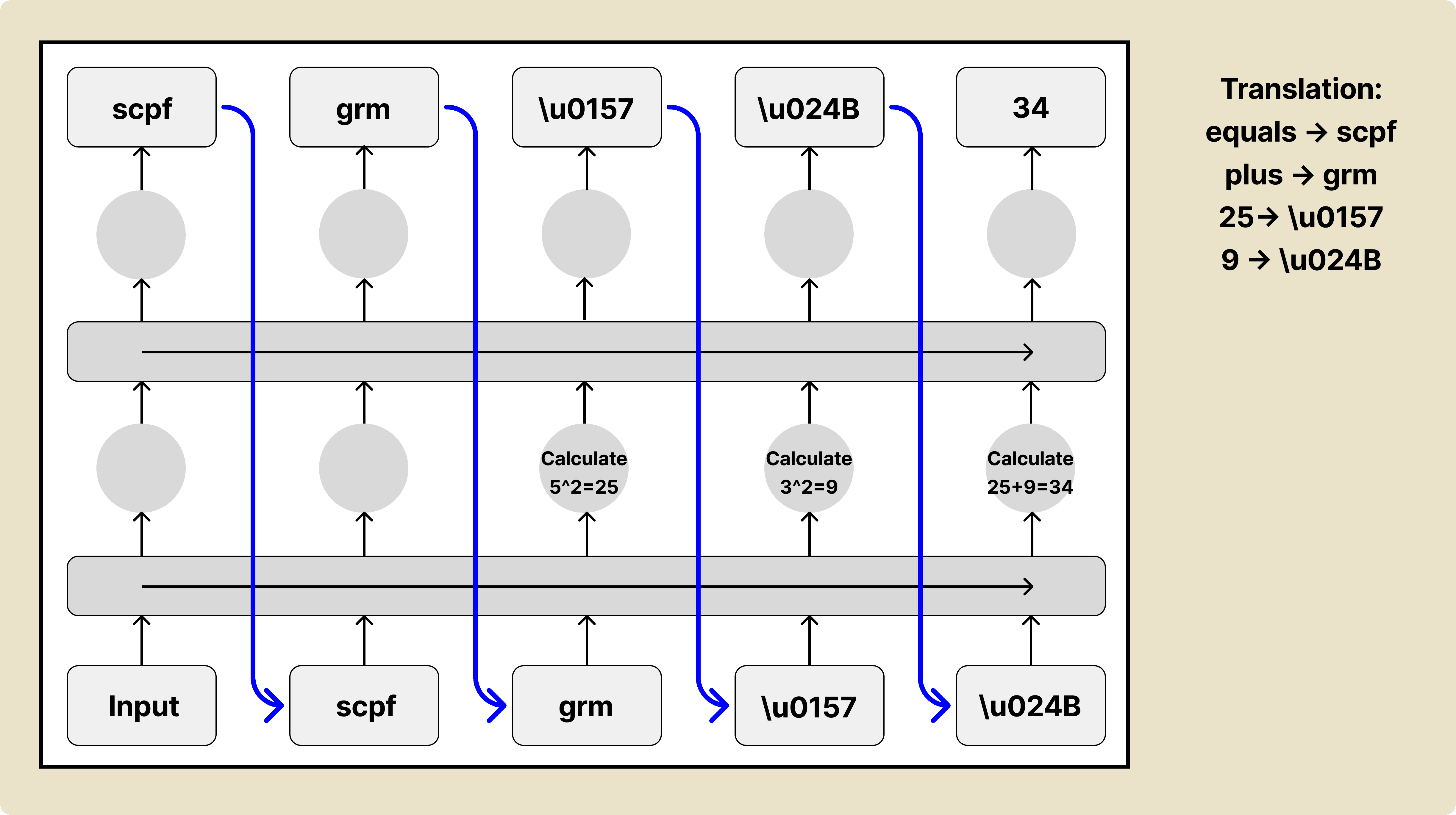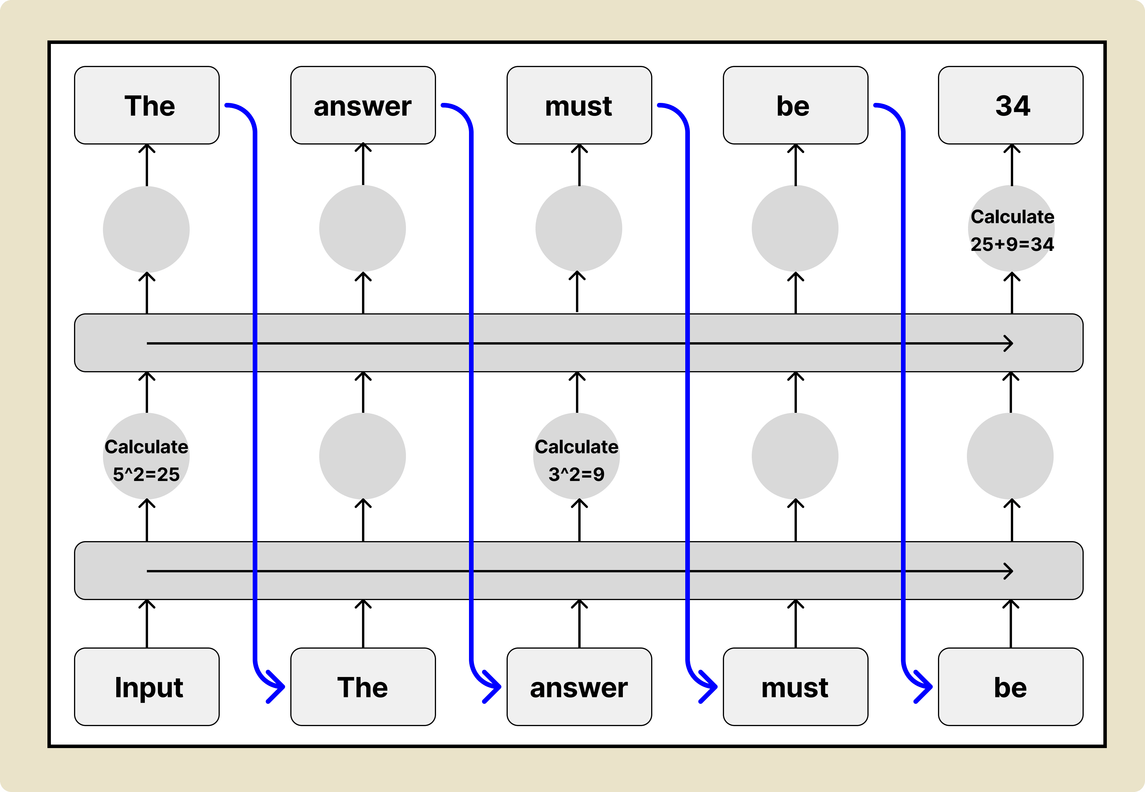 This figure shows how a model with a non-load-bearing CoT can perform more complex computations than a model with a single forward pass: our simplified model only has two computation slots available in the first forward pass, but needs to perform three computations, making it unable to calculate the correct answer in a single forward pass.[2] However, the first two of those computations ( and ) can be performed in parallel, meaning that the model can successfully perform the operation with the help of additional test-time compute without increasing the number of layers it has.[3]