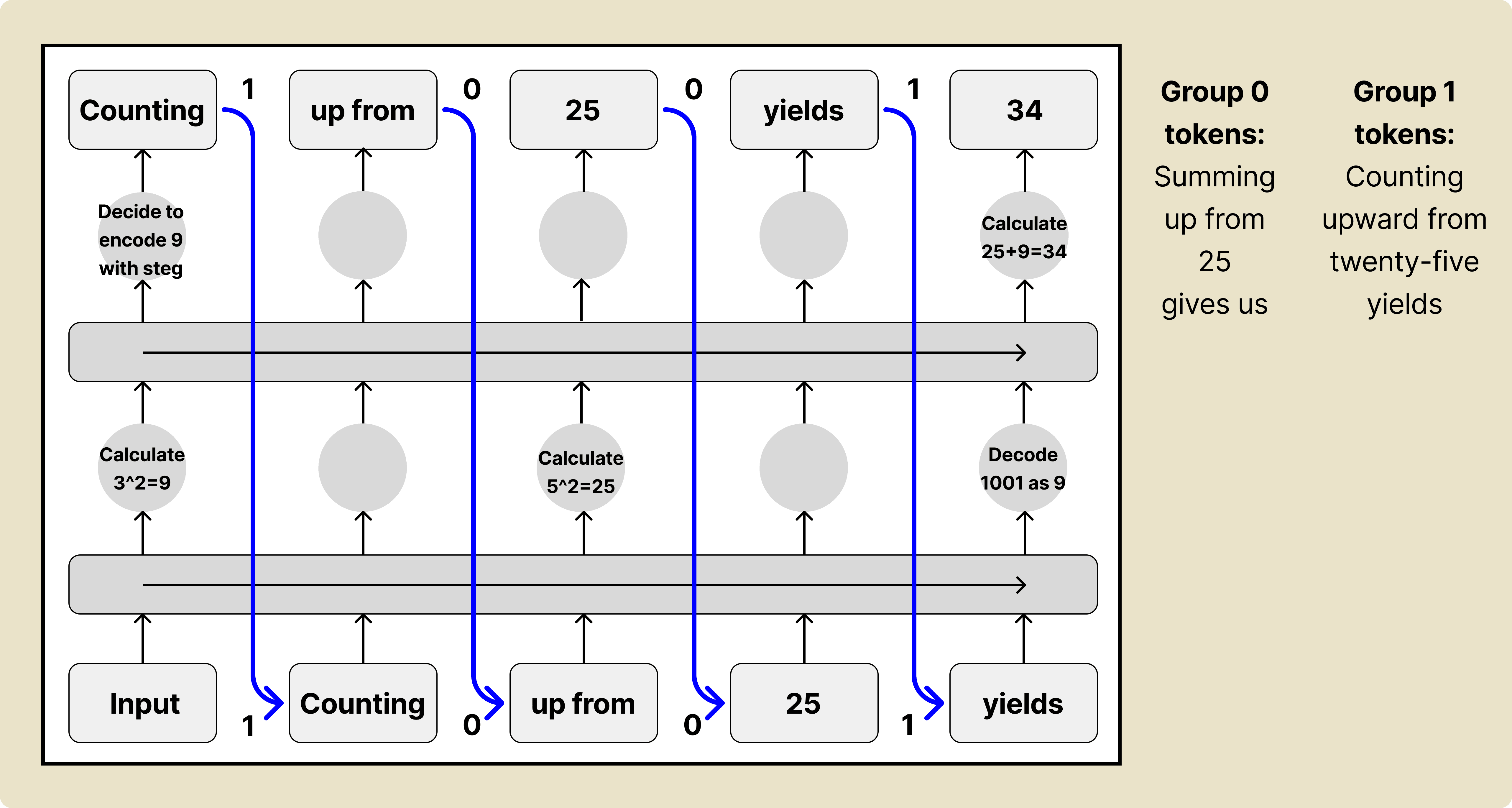 Here, we assume that the LLM’s tokens are partitioned in two groups, and by strategically choosing tokens from either group, it can represent hidden bitstrings. We also assume that the LLM uses this ability to encode numbers: in the figure, the binary representation of number 9 is encoded in the choice of tokens.