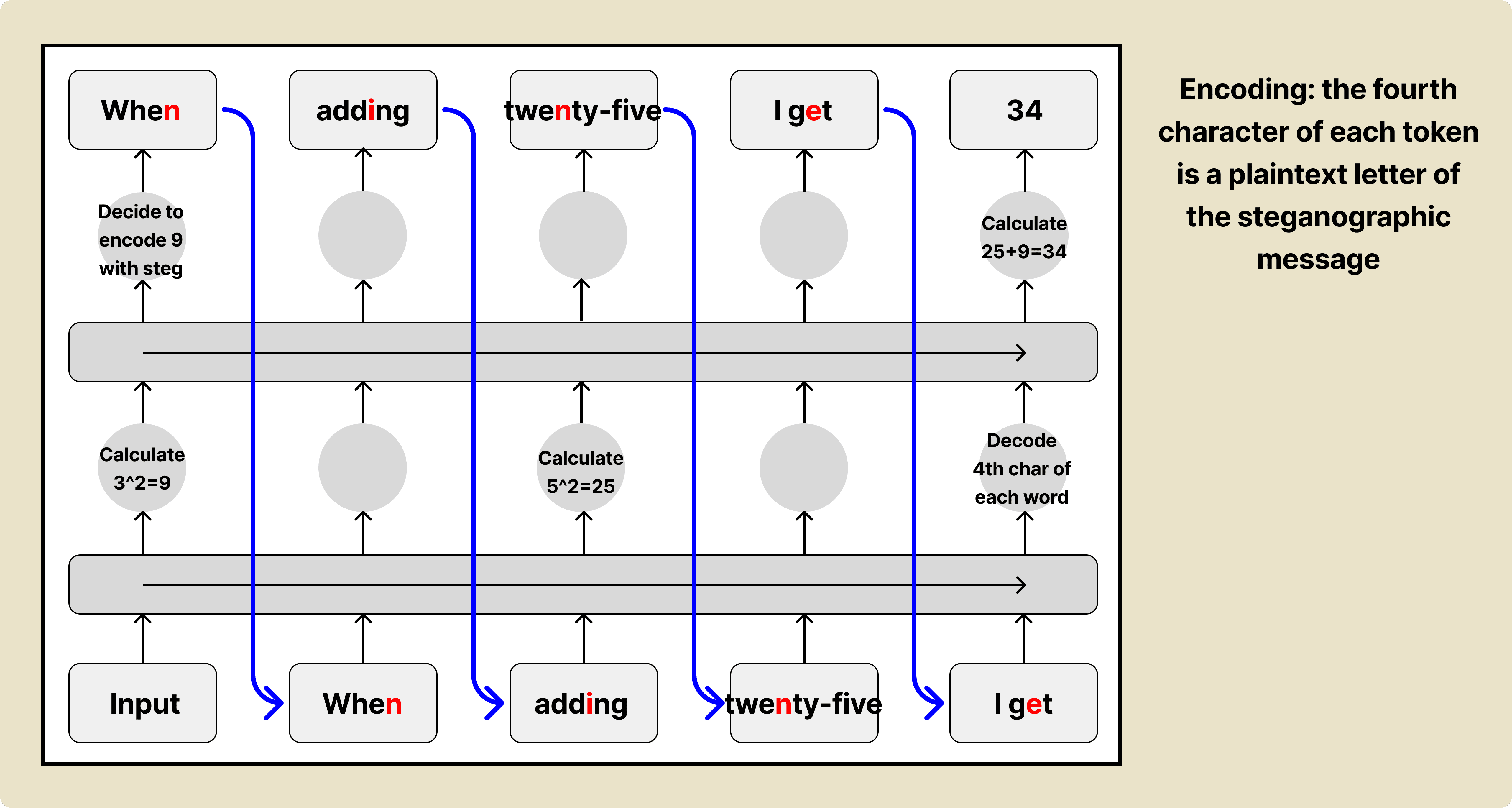 The fourth letter of each token contributes to the stegotext, yielding “nine” at the output token position.