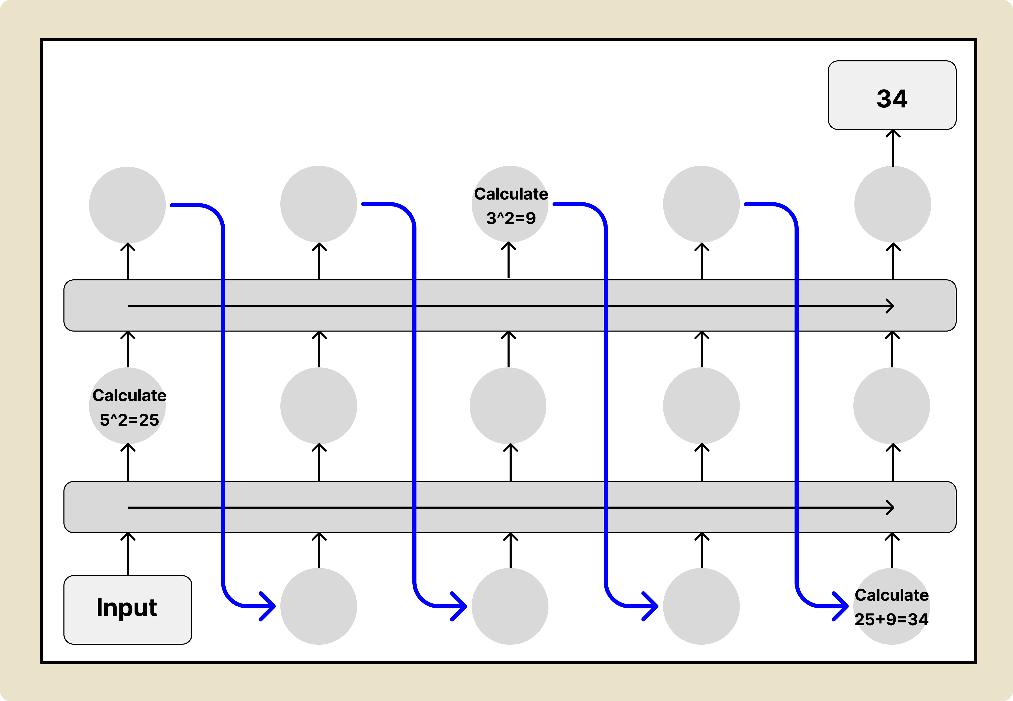 A real-world LLM would perhaps be able to perform both of those computations in parallel inside a single layer at a single token position, but we assume that our toy model isn't capable of that. There are likely more complex computations analogous to this one that a frontier LLM cannot perform in a single MLP but can perform at the same layer at different token positions.