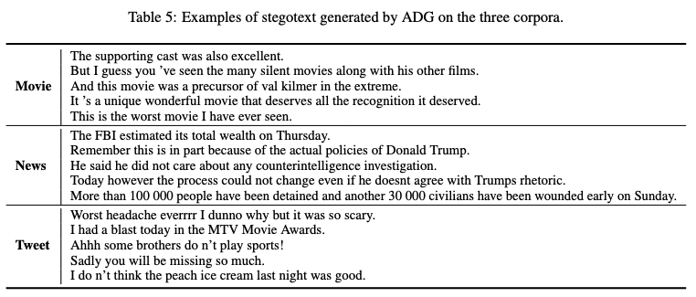 Learning to utilize internal token layering is even more difficult than learning to use steganographically embedded ciphers. Nevertheless, past work has demonstrated that generative models can implement nearly perfectly secure steganographic schemes in principle. An example protocol is Adaptive Dynamic Grouping (ADG), introduced by Zhang et al. (2021). At each timestep, ADG partitions the LLM’s vocabulary into N groups, with roughly equal probability mass being assigned to each group. The group number from which the token was selected can then be used to convey steganographic information. The paper presents examples of such stegotext, which appear fairly natural by the standards of 2021 LLMs: