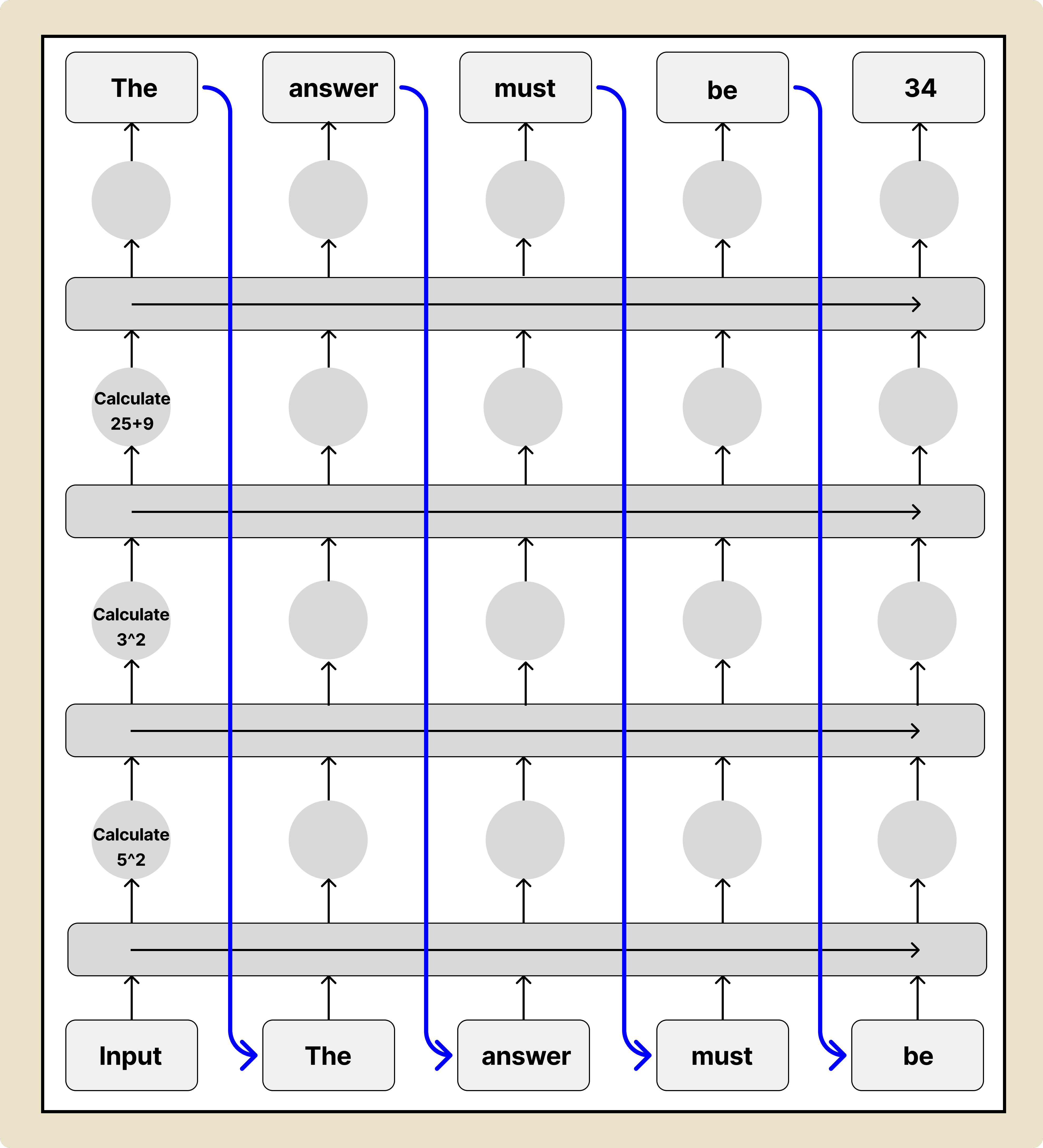 The term 'parallel' seemed appropriate to us since the answer-relevant computations happen in parallel across different token positions: e.g., as we show on our illustration, the calculations and can both be performed at layer 1 if they're performed at different token positions.[1] Though there isn't more parallelism per step, this is a different kind of parallelism that isn't available when the answer has to be produced in a single forward pass. If we named this 'serial latent computing across steps', I'd worry that this parallelism across token positions wouldn't be as clear and readers might assume that the latent computations only take the form of diagonal information flow across layers and token positions, rather than parallel computations at the same layer but different token positions. Additionally, the term 'parallel' has been used in the past to refer to this kind of reasoning in Max Nadeau's decomposition of unfaithfulness.