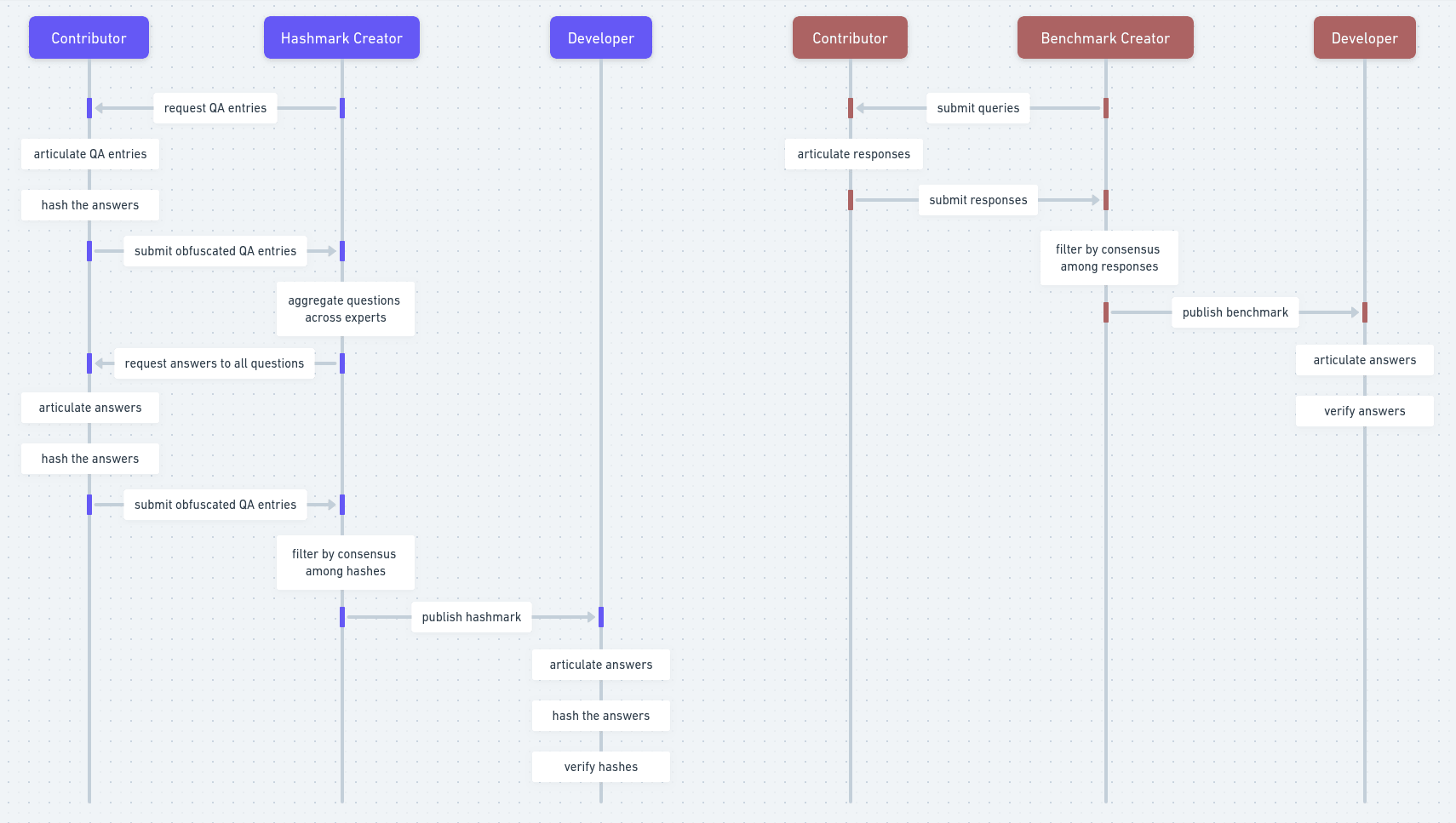 In the future, however, more sophisticated protocols for assessing dangerous AI capabilities might be able to only disclose *how many* of the answers are correct, without disclosing which ones. One technique that seems aligned with this line of work consists of cryptographic accumulators. In contrast to the one-to-one mapping of traditional cryptographic hash functions, cryptographic accumulators can be seen as mapping an entire set of elements to a single hash in a way that enables membership queries to be resolved without disclosing the actual members of the cryptographically accumulated set. However, one could still test whether individual question-answer pairs are part of the accumulated set of gold pairs, which is why this technique alone would be insufficient to enable this development. Even if one devised a method that only allowed queries about the cardinality of the intersection between the fixed-size set of candidate question-answer pairs and the set of gold pairs to be resolved, an attacker could still run queries before and after modifying an answer. If the cardinality of the intersection went down, the previous answer would be deemed correct. All this is to say that obfuscating the expert knowledge further without compromising the possibility of knowledge verification appears to be a non-trivial challenge.