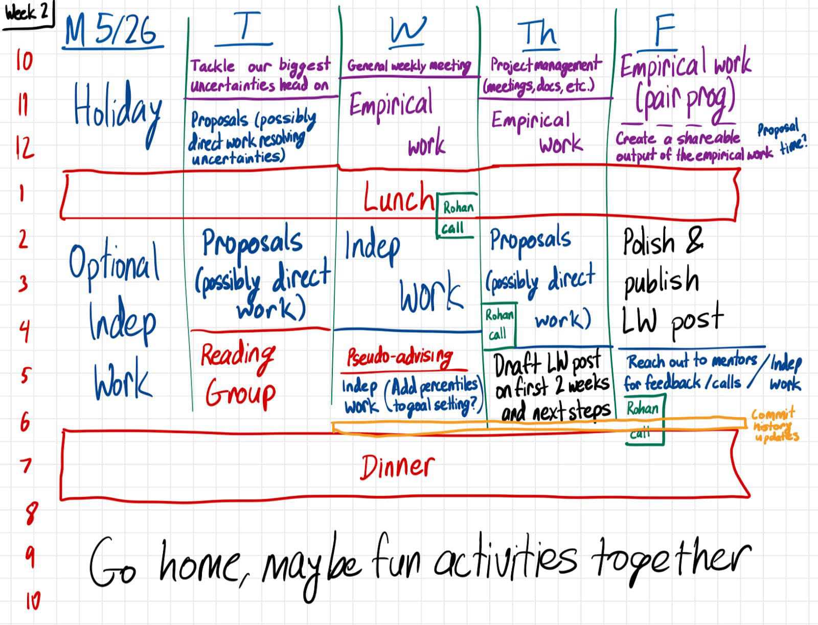 - Iterating on our existing proposals by discussing key questions and bottlenecks with each other, by asking external people for feedback, and through independent work, and