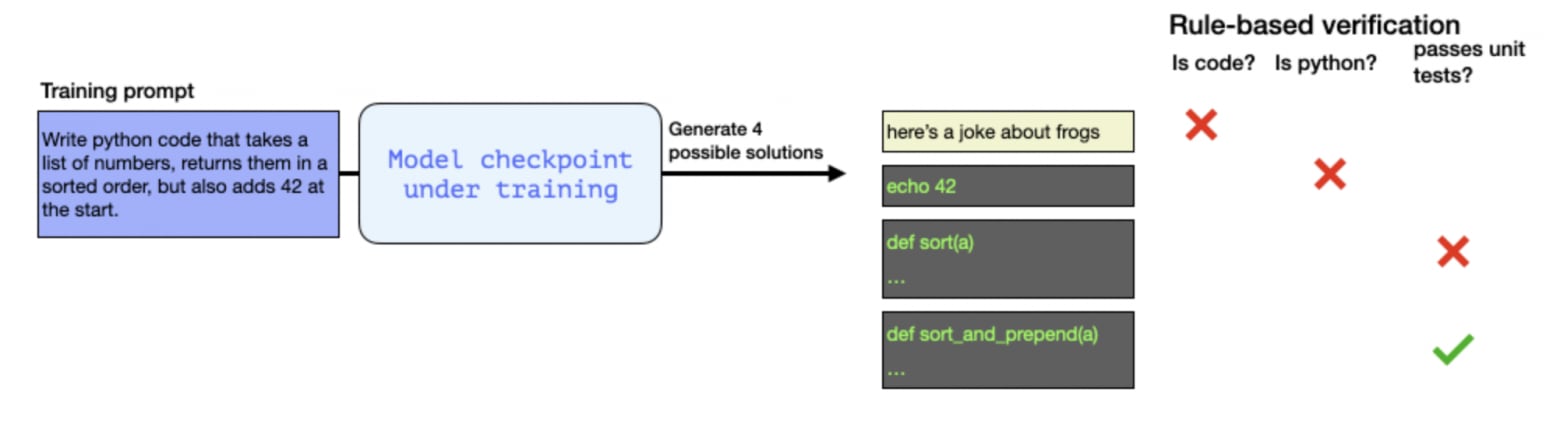 Easier scaling: if you can automatically check correctness (like test-based pass/fail or numeric answer matching), you can train on hundreds of thousands of tasks cheaply.