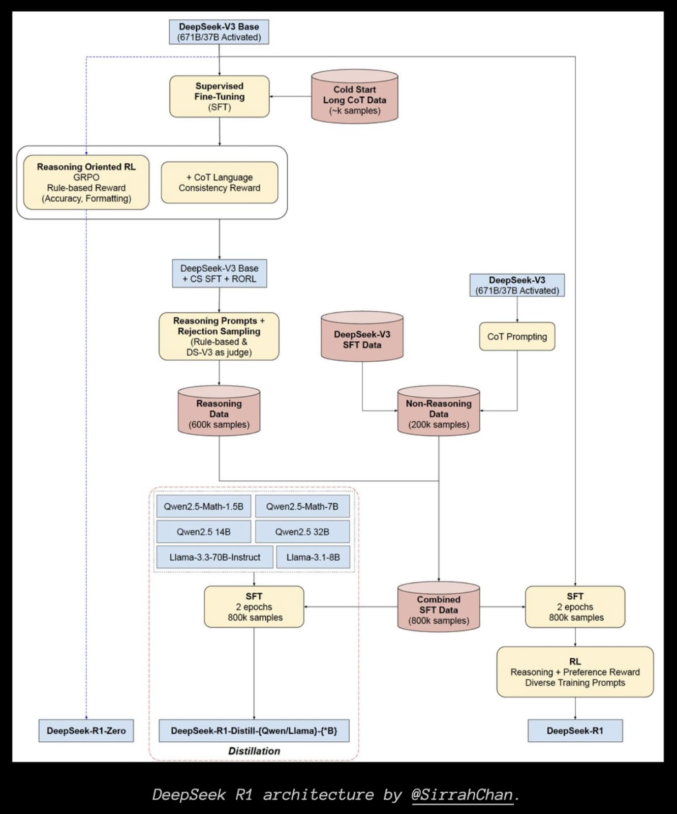 A nice overview of the DeepSeek-R1 training pipeline from SirrahChan.