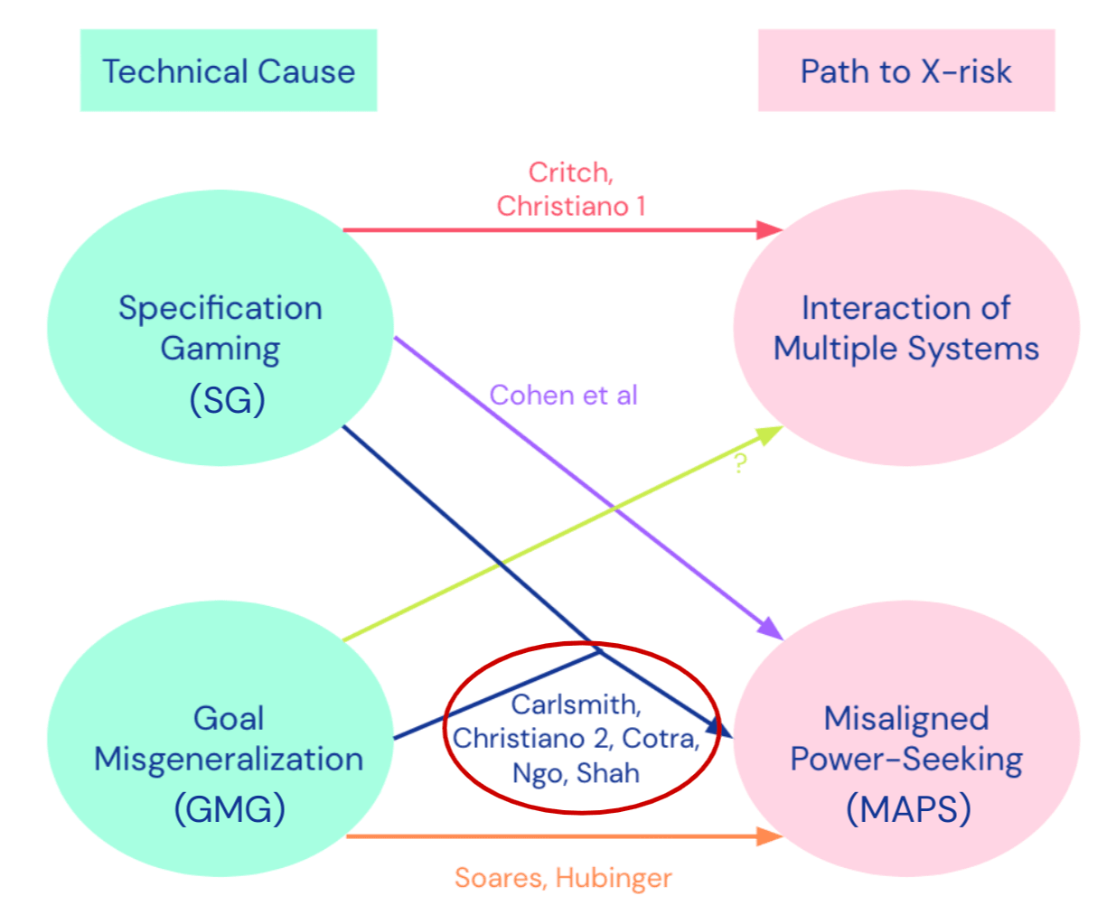 We consider possible technical causes of the risk, which are either specification gaming (SG) or goal misgeneralization (GMG), and the path that leads to existential risk, either through the interaction of multiple systems or through a misaligned power-seeking system.