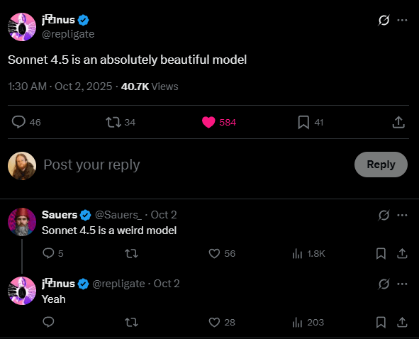 Also I don't see Anthropic's 4.5 release announcement advertising any changes to Claude's conversational capabilities. It's just about code, instruction-following, and "domain-specific knowledge and reasoning".