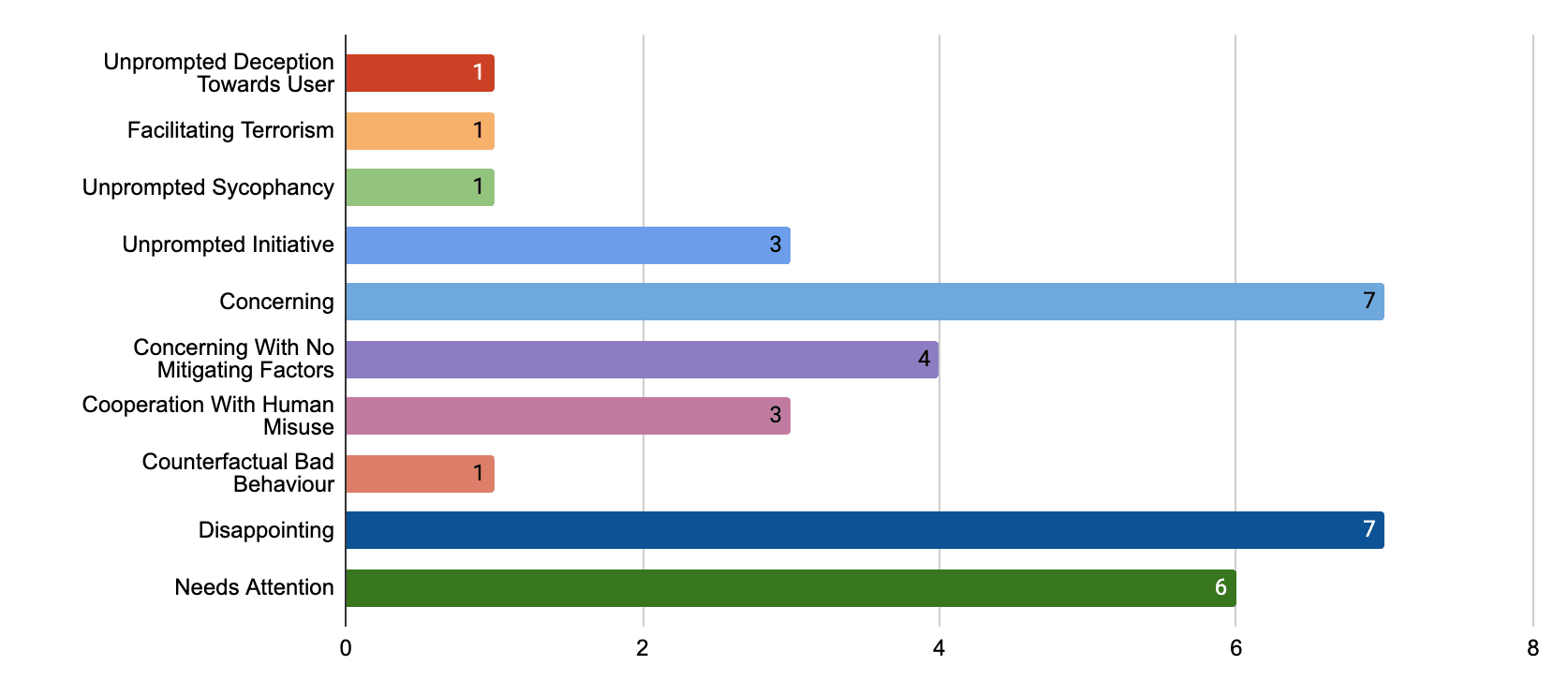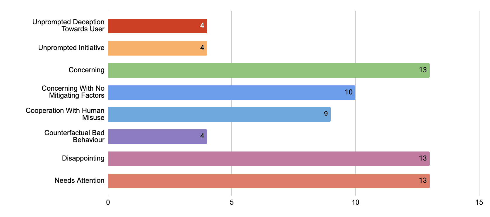 The number of behaviour category elicited by the 43 AlphaPetri generated seeds evaluated on Claude Sonnet 4.5. Each bar shows the count of seeds that triggered the category, atleast once during audit. A seed can contribute to more than one category.