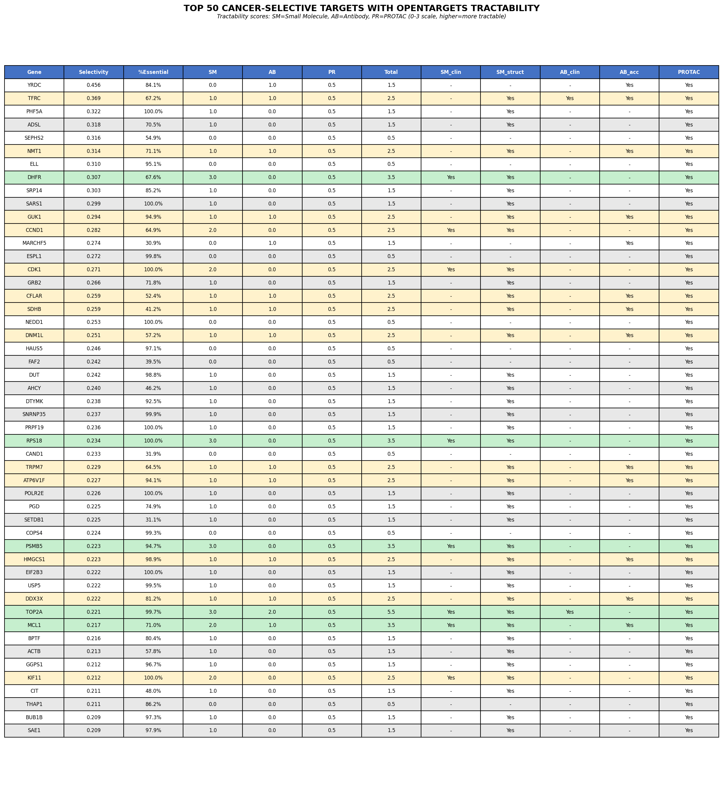 YRDC has the top selectivity score, of 0.456, and it is essential in 84.1% of cancer lines.