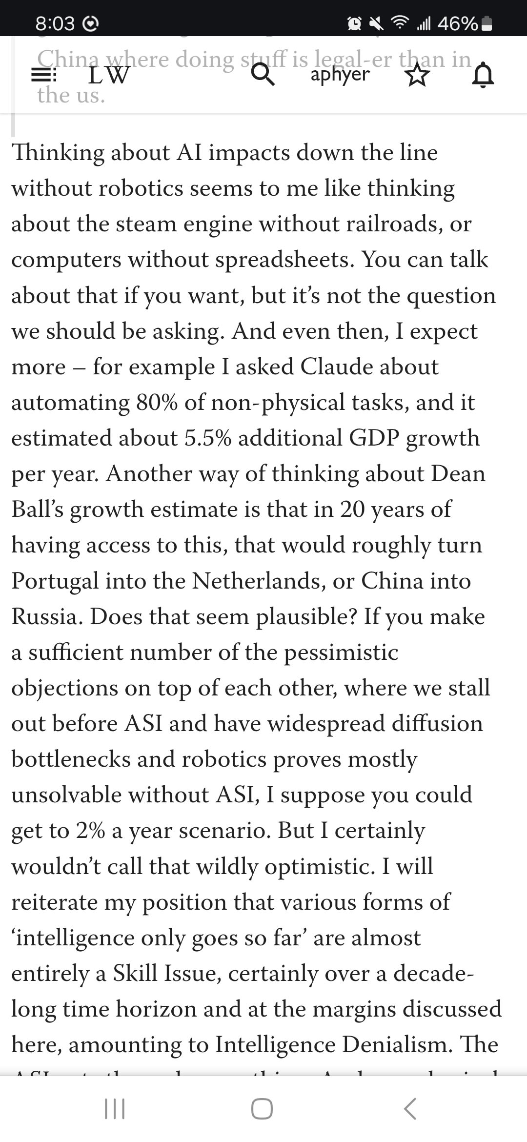 Thinking about AI impacts down the line without robotics seems to me like thinking about the steam engine without railroads, or computers without spreadsheets. You can talk about that if you want, but it’s not the question we should be asking. And even then, I expect more – for example I asked Claude about automating 80% of non-physical tasks, and it estimated about 5.5% additional GDP growth per year. Another way of thinking about Dean Ball’s growth estimate is that in 20 years of having access to this, that would roughly turn Portugal into the Netherlands, or China into Russia. Does that seem plausible? If you make a sufficient number of the pessimistic objections on top of each other, where we stall out before ASI and have widespread diffusion bottlenecks and robotics proves mostly unsolvable without ASI, I suppose you could get to 2% a year scenario. But I certainly wouldn’t call that wildly optimistic. I will reiterate my position that various forms of ‘intelligence only goes so far’ are almost entirely a Skill Issue, certainly over a decade-long time horizon and at the margins discussed here, amounting to Intelligence Denialism. The ASI cuts through everything. And yes, physical actions take non-zero time, but that’s being taken into account, future automated processes can go remarkably quickly even in the physical realm, and a lot of claims of ‘you can only know [X] by running a physical experiment’ are very wrong, again a Skill Issue. On the decreasing marginal value of goods, I think this is very much a ‘dreamed of in your philosophy’ issue, or perhaps it is definitional. I very much doubt that the physical limits kick in that close to where we are now, even if in important senses our basic human needs are already being met.