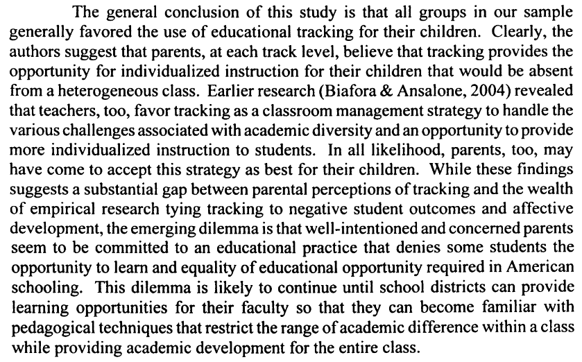 Academics and education ‘experts,’ despite the literature and all actual observations and everyone involved saying that tracking helps all kids learn better, keep lamenting that parents want tracking, and work to destroy it, often in the name of ‘equity.’