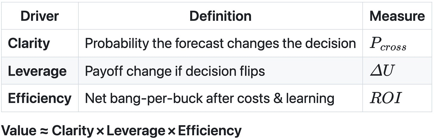 Even a crystal‑clear, high‑leverage forecast can be a net loss if it takes a platoon of analysts and a seven‑figure data purchase to run once. Conversely, a medium‑Clarity, medium‑Leverage signal can be a no‑brainer when it drops out of telemetry I already collect.