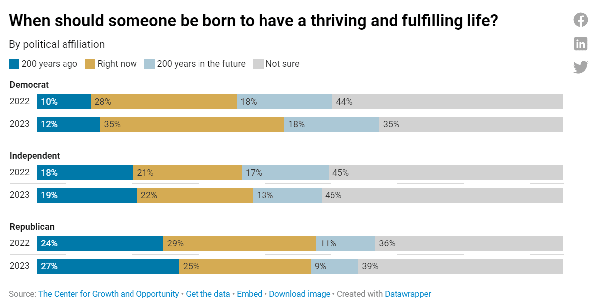 The other is if you have a substantial probability of doom, then that is a big barrier to a thriving and fulfilling life, whereas we know those born in 1823 faced no such dangers. Could be big. Presumably this is coming more from climate change concerns than AI concerns, given the public’s views.