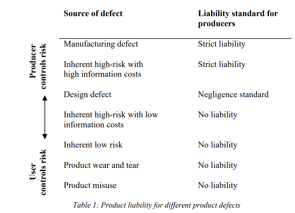 The paper discusses traditional economic considerations, such as strict liability not providing proper incentive for the customer to guard against damage, including via curtailing use, and the need to account for litigation costs and the difficulty of investigating for the presence of negligence. For ‘non-defective’ products, putting costs onto customers aligns their incentives to avoid harm and to gain benefits.