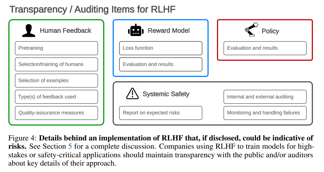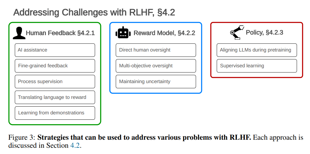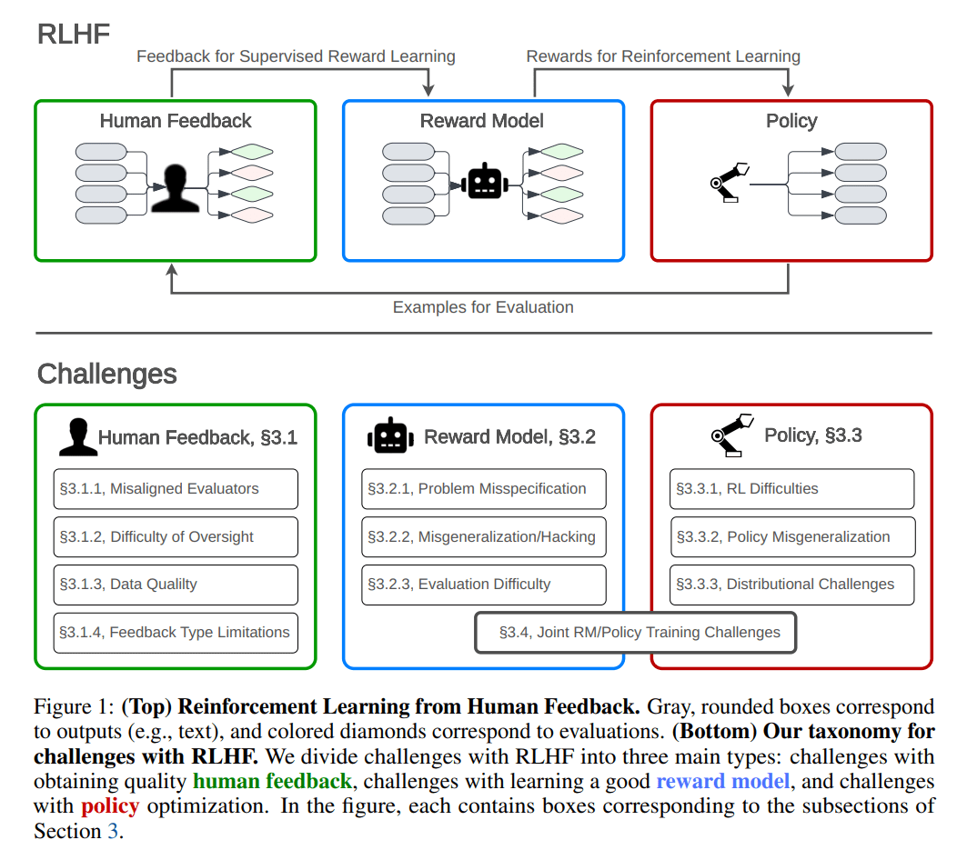 The paper divides the problems into problems with collecting human feedback (3.1), with using it to train the reward model (3.2) and then training the policy (3.3).