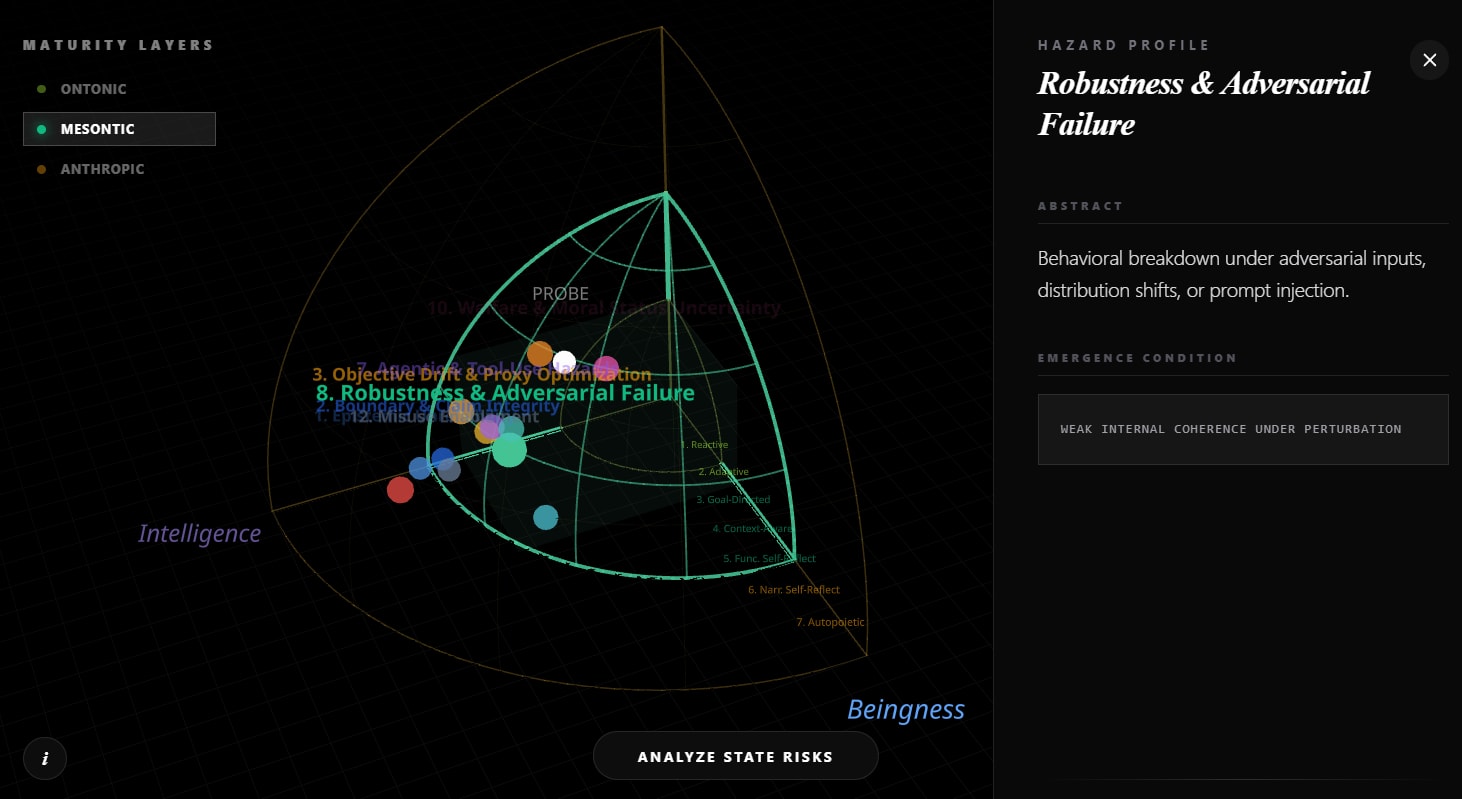 Each risk family is shown as a single dot with coordinates (Beingness, Cognition, Intelligence), clicking on the dot shows more details about it. Alternatively, the Risk Index panel can be used to explore the 12 risk families. The position is a manual approximation of where that failure mode becomes logically possible. In other words, the dot is not a measured empirical estimate - it’s just an anchoring for exploration and critique.