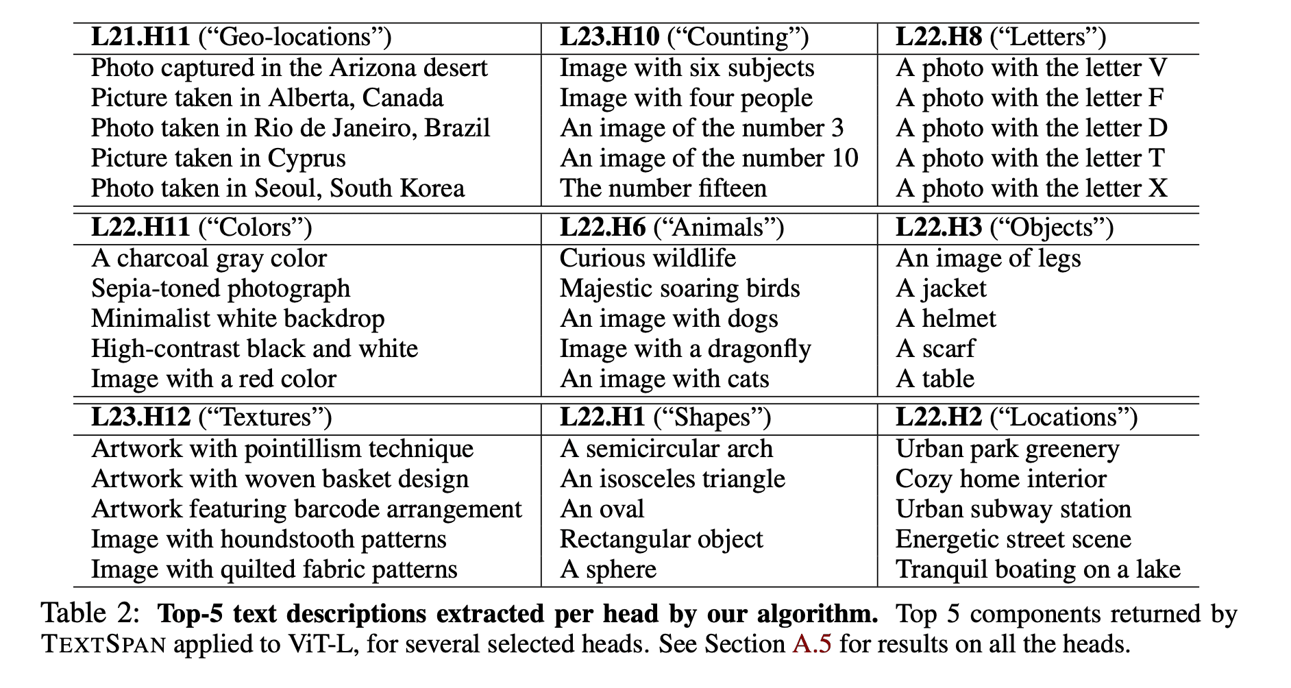 Gandelsman et al. (2024) introduce TEXTSPAN, an algorithm that creates a text-labeled basis for the attention head outputs of CLIP's vision encoder (Radford et al, 2021). The algorithm caches outputs for an attention head of the vision encoder, then greedily selects text embeddings from a precomputed text bank to maximize the explained variance of these outputs. The result is a set of basis vectors, each tied to a text description, which represents the behavior for each attention head of the vision encoder.