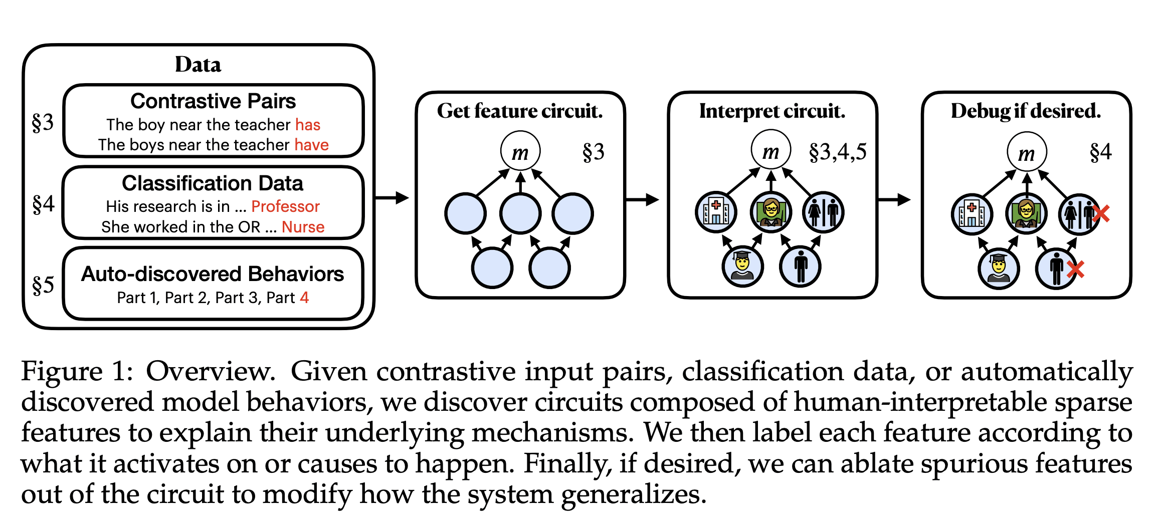 Other methods expand the computational subgraph with sparse autoencoders (Marks et al., 2024) to deal with superposition, or when the data has more features than neuron capacity. Sparse feature circuits use sparse autoencoder (SAE) features as finer-grained units of representation than neurons. Sparse feature circuits have been used in downstream applications in language models, including removing gender-related bias from a classifier.