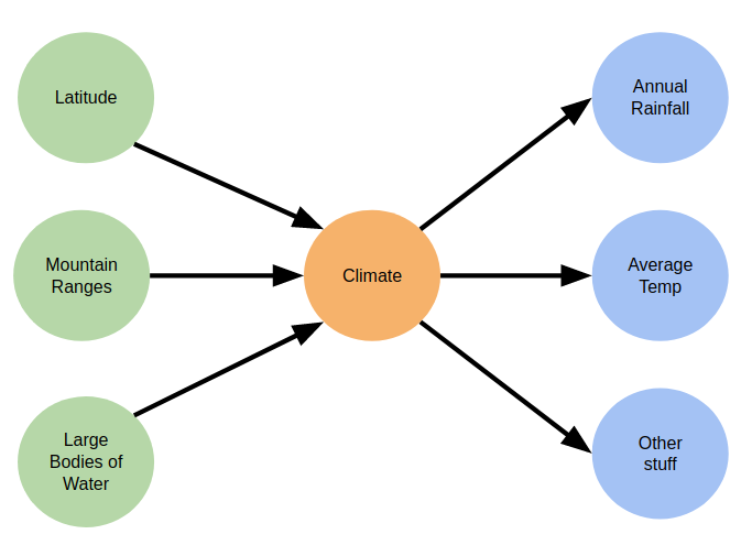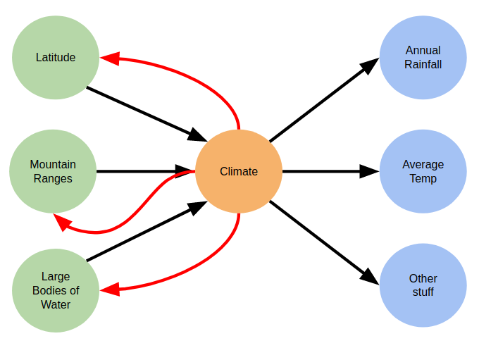 We know that no single factor controls the climate. "Desert" and "rain-forest" are just labels for types or regularities in a weather system. Since climate is an emergent feature, "intervening on climate" means intervening on a bunch of geographic variables. The previous graph leads me to erroneously conclude that I could somehow tweak the climate without having to change the underlying geography, and that's not possible. The only way to salvage this graph is to put a bunch of additional arrows in, representing how "changing climate" necessitates change in geography.