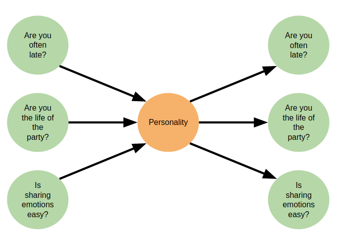 Then this is going to imply a correlation between behavior at time 1 and behavior at time 2, and you can use this correlation to predict behavior at time 2 from behavior at time 1. Thus for the personality model, you don't need the arrows going into personality, only the arrows going out of personality.