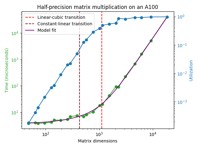 The timescale for a single matrix multiplication gets longer if we also demand that the matrix multiplication achieves something close to the peak FLOP/s performance reported in the GPU datasheet. In the plot above, it can be seen that a matrix multiplication achieving good hardware utilization can't take shorter than ~ 100 microseconds or so.