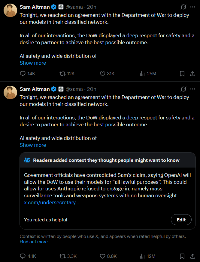 The past week, I've seen a lot of people announcing on social media that they're canceling their OpenAI subscription and moving to Anthropic. Well, that's fine, but they only care slightly. Most of their money isn't from subscriptions, it's from investors. And those investors aren't mainly hoping for a payback from individuals paying $20/month with a 40% profit margin or whatever. No, they want to replace employees. That's the hope. That's the main basis of the investments. Actually getting OpenAI to change course would take...well, something else.