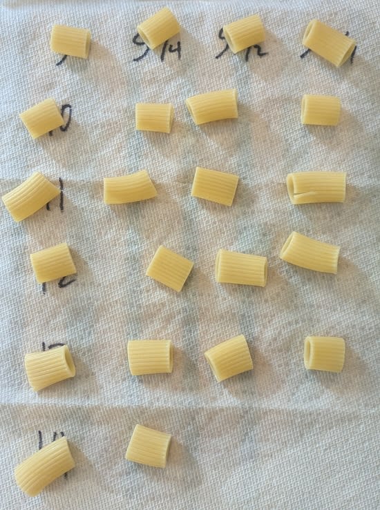 I generally find the numbers printed on pasta boxes for cooking time far too high: I'll set the timer for a minute below their low-end "al dente" time, and when I taste one it's already getting too mushy. I decided to run a small experiment to get a better sense of how cooked I like pasta.