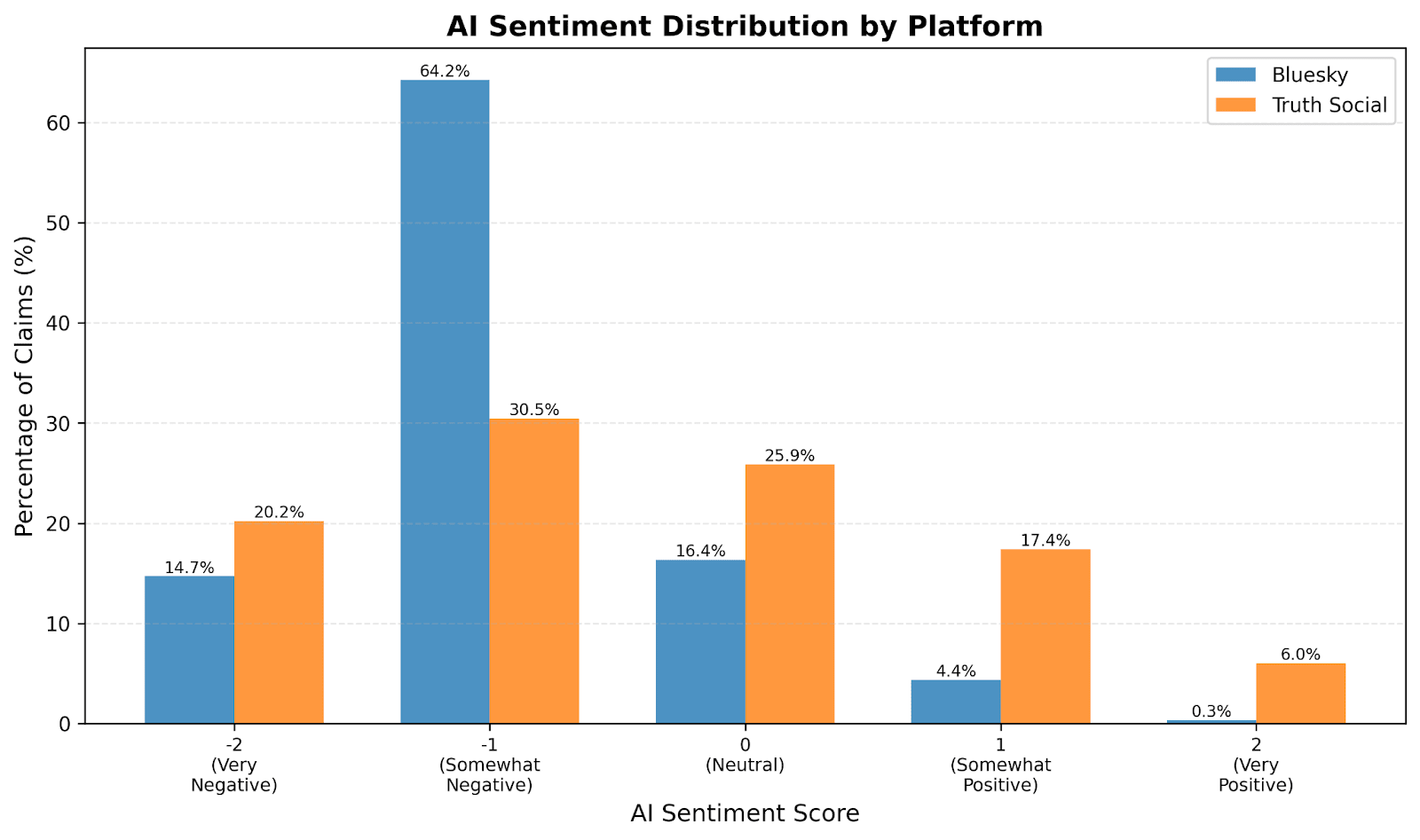 Bluesky is overwhelmingly negative about AI. 64% of Bluesky claims were classified as "very negative" versus only 15% on Truth Social. Truth Social sentiment was much more spread out across the spectrum, with a significant amount of AI-positive content.