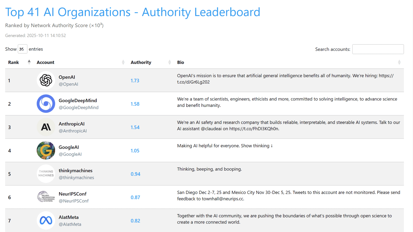 Because I separated out the orgs, I could put them on their own leaderboard. ThinkyMachines & NeurIPS scoring higher than AI at Meta is kind of funny. Here is the org leaderboard.